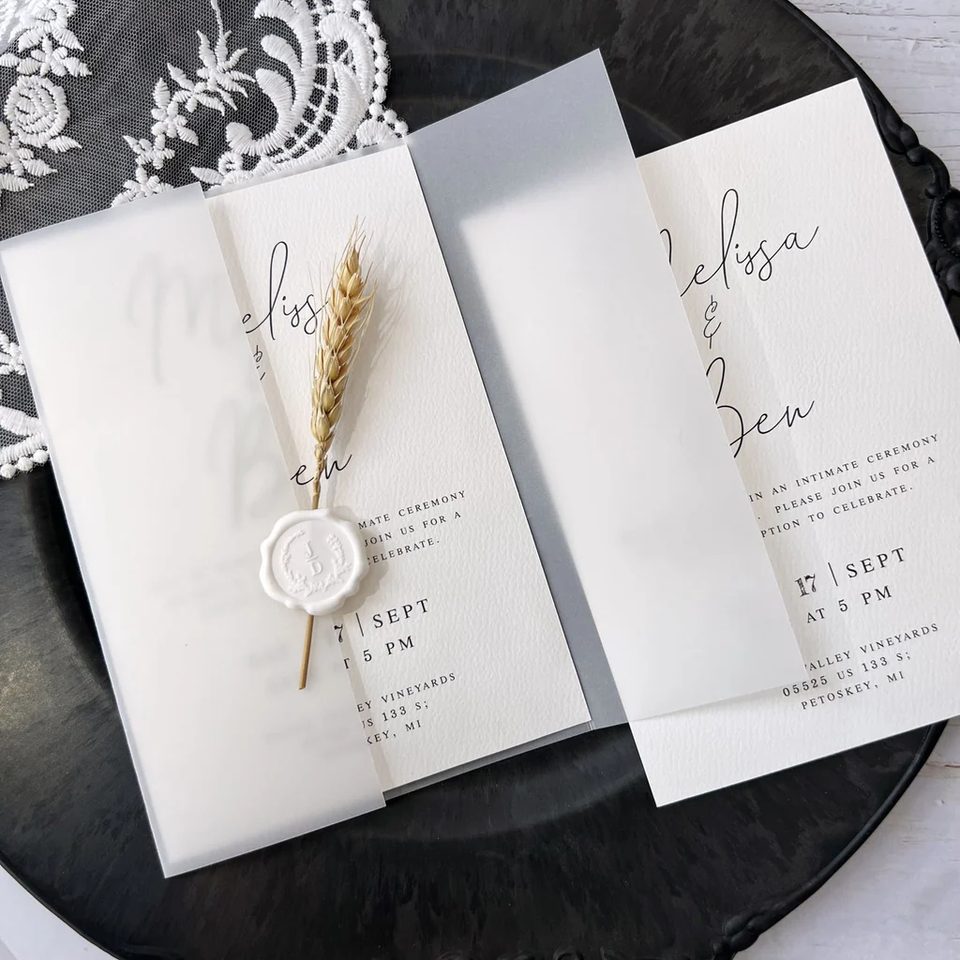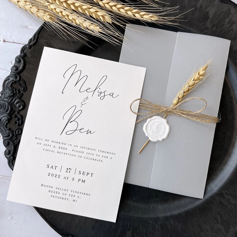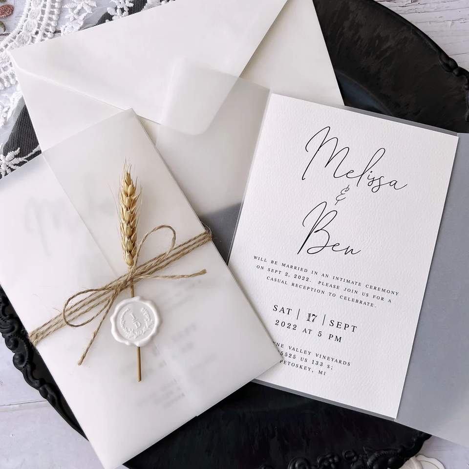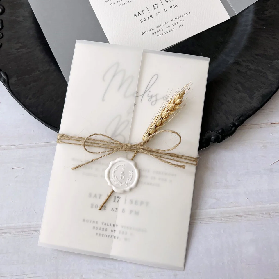 การ์ดเชิญงานแต่งงานหนังวัวขนาด5x7นิ้วพร้อมตราประทับและข้าวสาลีกระดาษห่อแจ็คเก็ตทำด้วยมือ