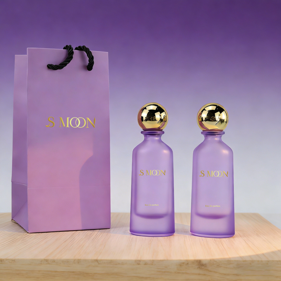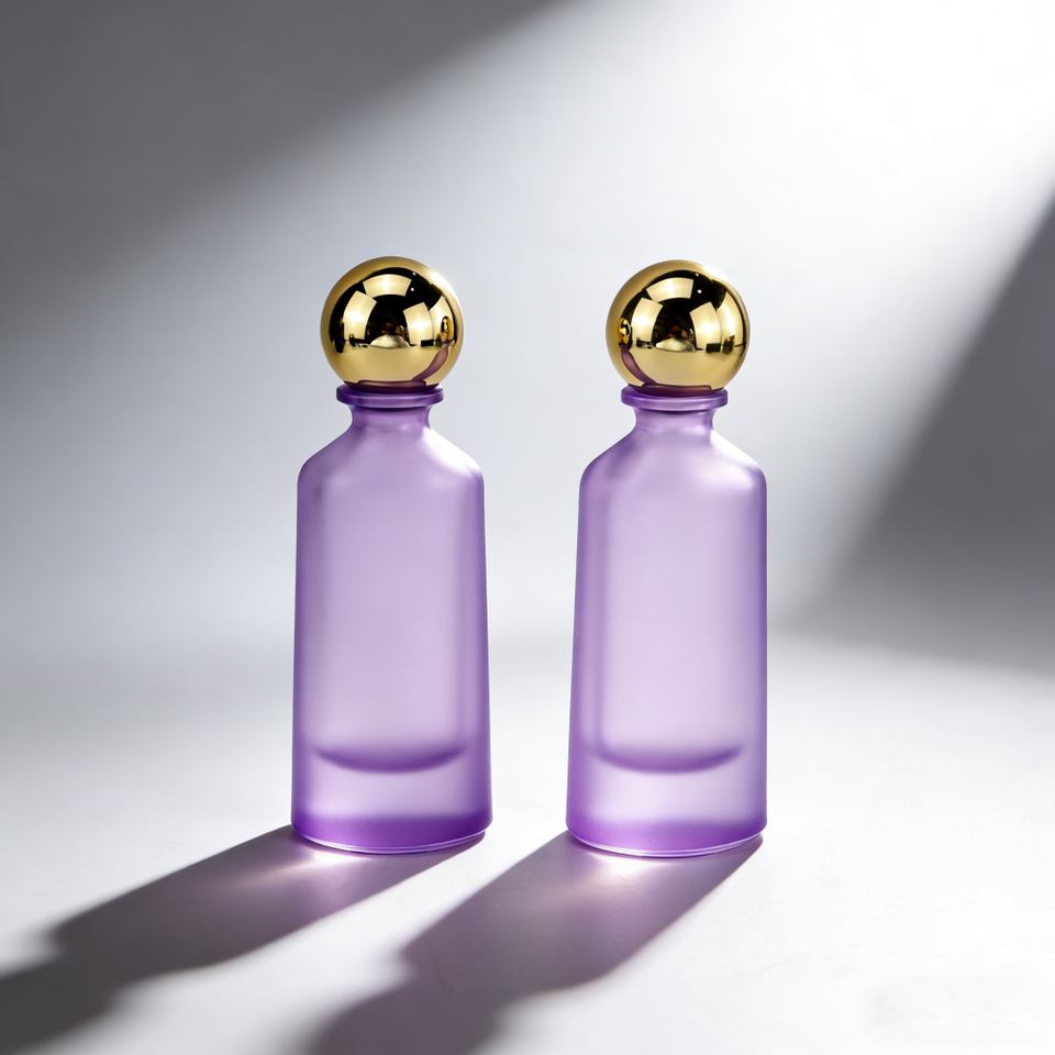 ขวดน้ำหอมแก้วสีม่วงขนาด 50 มล. แบบกำหนดเอง ขวดน้ำหอมแก้วทรงกระบอกแฟนซีแบบพ่น สำหรับฝาแบบลูกบอล พร้อมกล่องทรงกลม