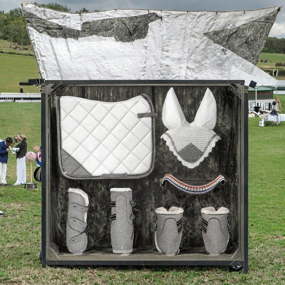 ชุดอุปกรณ์ขี่ม้าแบบปรับแต่งได้ AWI-SP-0044 ประกอบด้วยแผ่นรองอาน/ผ้าคลุมกันแมลง/รองเท้าม้า/ที่คาดหน้าผาก วัสดุภายนอกทำจากผ้าฝ้าย วัสดุภายในทำจากโพลีเอสเตอร์ ซับในทำจากผ้าโพลีคอตตอน