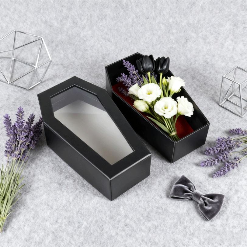 กล่องบรรจุภัณฑ์แบบกำหนดเอง ย่อยสลายได้ทางชีวภาพ สำหรับของขวัญ อุปกรณ์เสริมโลงศพ ดอกไม้ เครื่องประดับ กล่องโลงศพ บรรจุภัณฑ์ฮาโลวีน กล่องกระดาษแข็ง