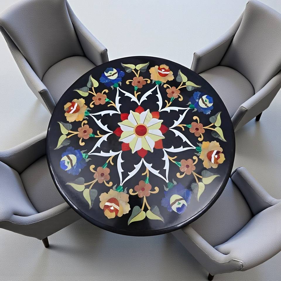 ท็อปโต๊ะหินอ่อนสีดำแบบสั่งทำพิเศษ แกะสลักด้วยมือ งานศิลปะ Pietra Dura โต๊ะกาแฟ สำหรับตกแต่งภายในและภายนอกอาคาร