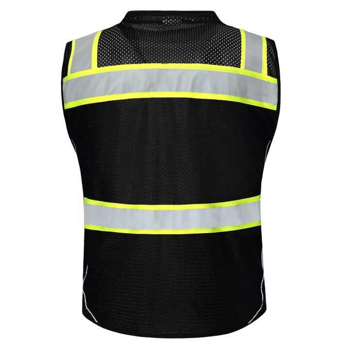 เสื้อกั๊กนิรภัยสะท้อนแสงสีดำแบบปรับแต่งโลโก้บริษัทพร้อมกระเป๋าสีเรืองแสงสะท้อนแสงเสื้อกั๊กนิรภัยชั้น2แบบกำหนดเอง