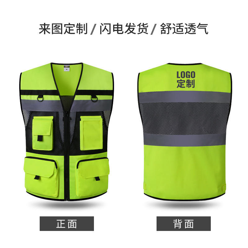 มองเห็นได้ชัดเจน, กระเป๋าหลายช่อง, สะท้อนแสง, งานก่อสร้าง, การจราจร, โลโก้ที่กำหนดเอง, ความปลอดภัย, ถนน, ซักได้, ใช้ซ้ำได้, ระบายอากาศ, โลโก้ที่กำหนดเองคุณสมบัติพิเศษ