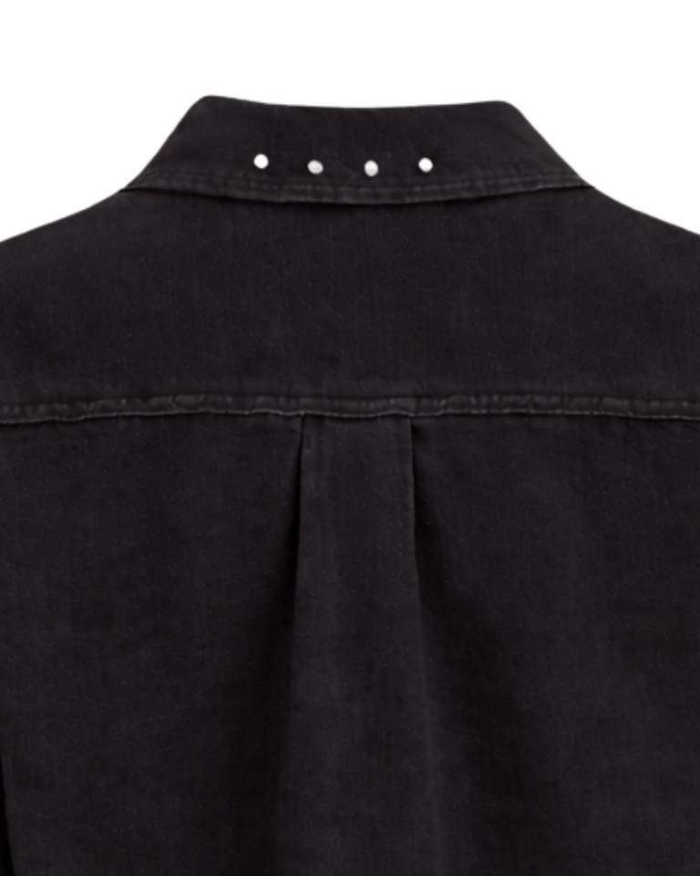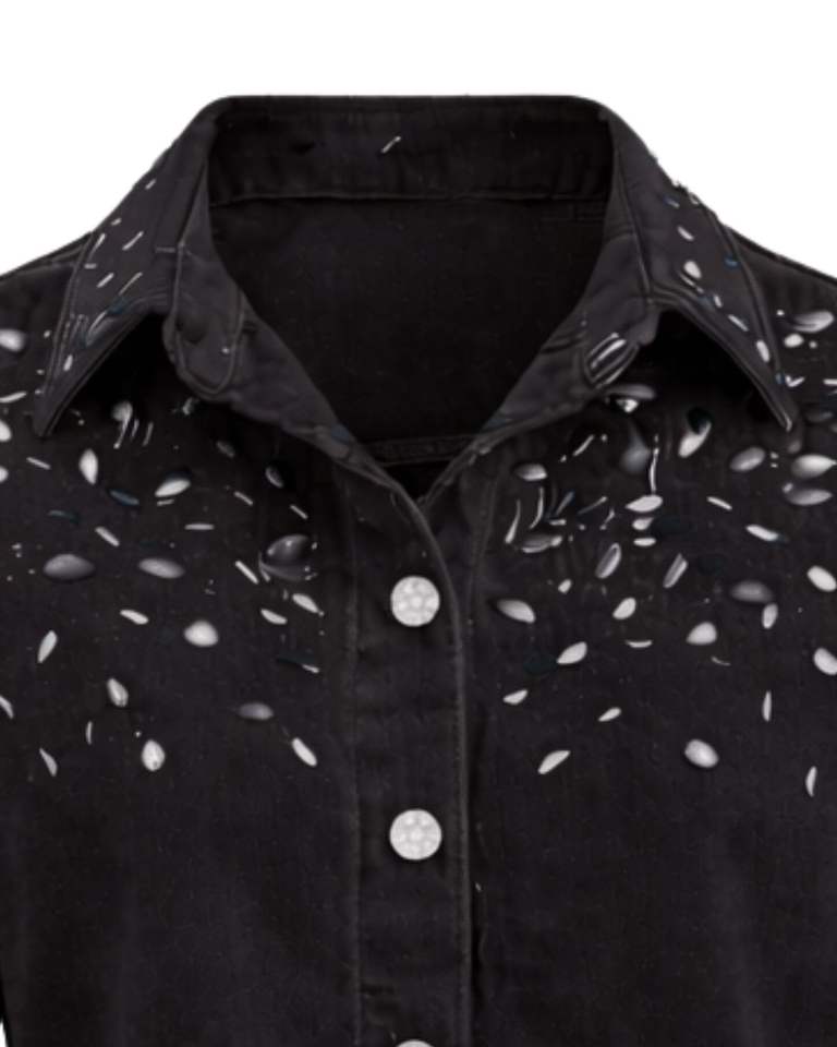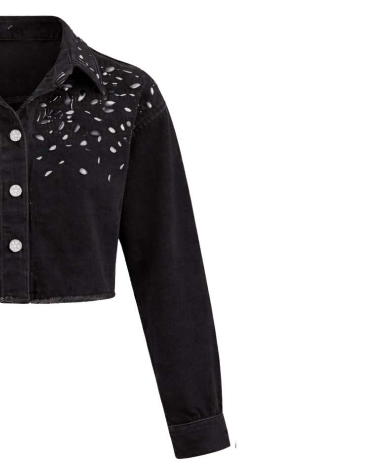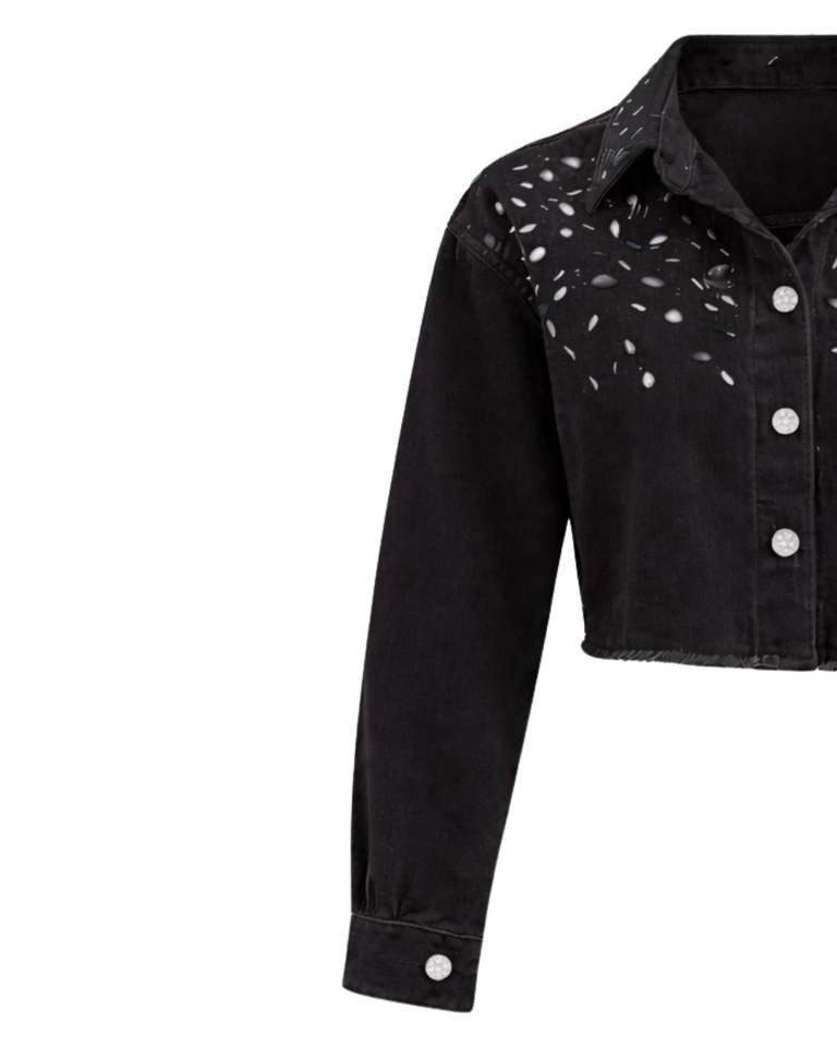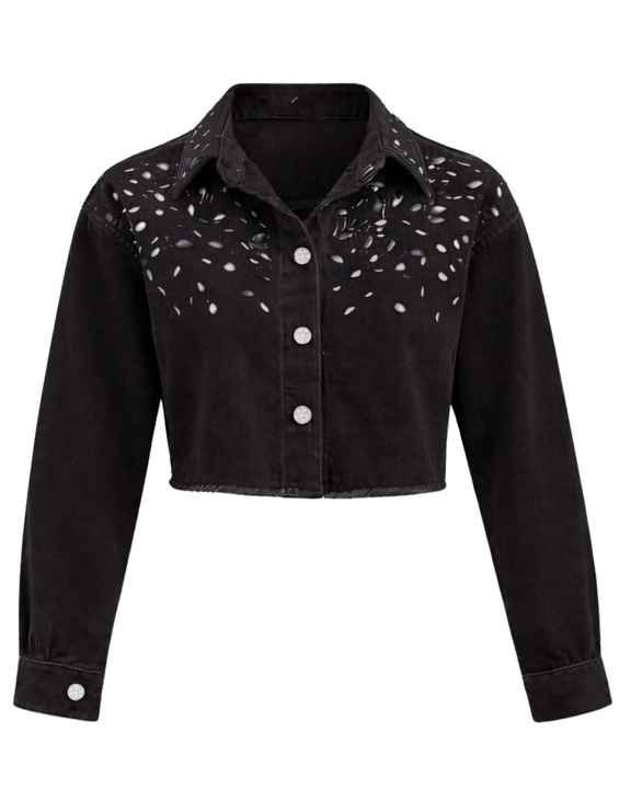 เสื้อแจ็คเก็ตยีนส์ครอปสีดำสำหรับผู้หญิง ตกแต่งด้วยกระดุมติดเพชรที่ปกเสื้อ แขนยาว สไตล์สตรีทแฟชั่น