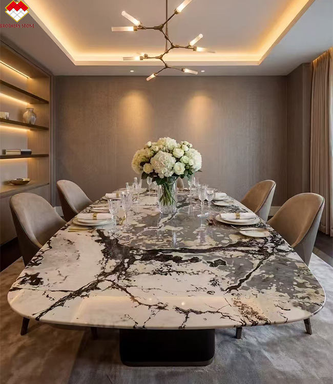 โต๊ะอาหารหินอ่อนสีดำขาวแบบกำหนดเอง เคาน์เตอร์ครัว ท็อปโต๊ะเครื่องแป้ง หินอ่อนนาโปเลียนสีดำ ชุดโต๊ะอาหารและเก้าอี้