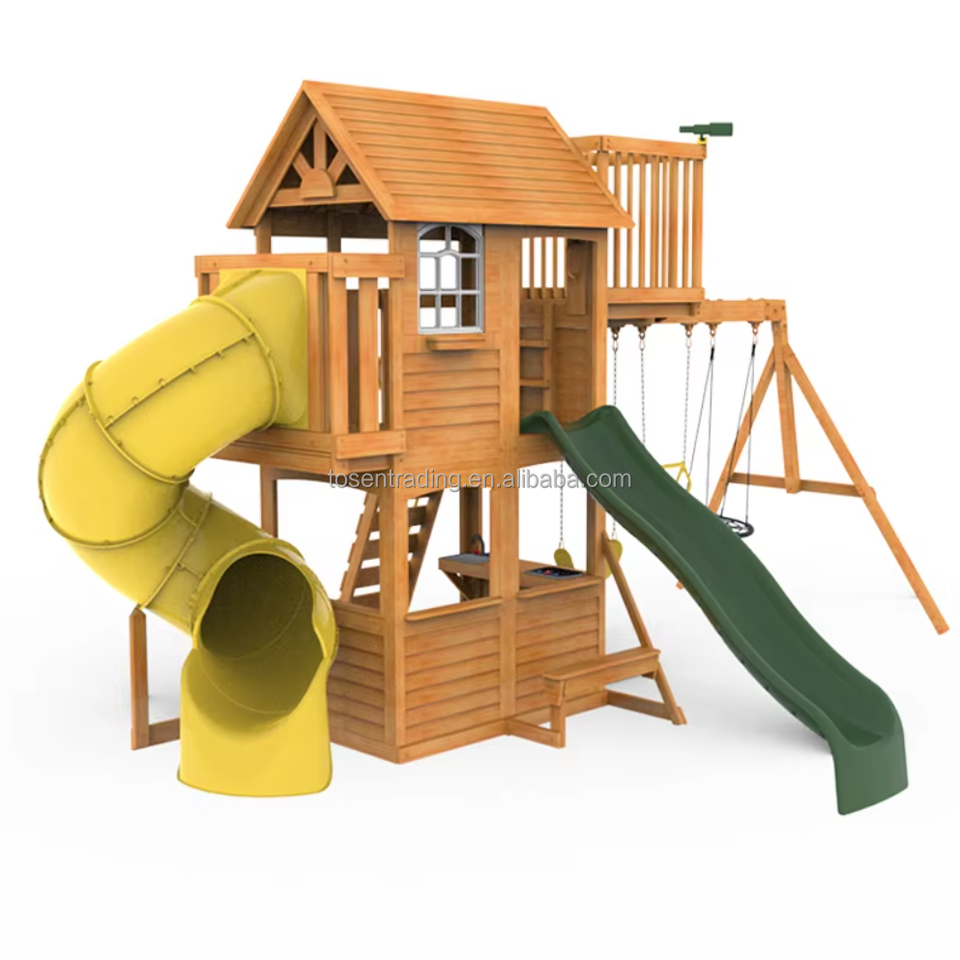บ้านเด็กเล่นไม้กลางแจ้งแบบกำหนดเองได้ พร้อมสไลเดอร์ไม้ซีดาร์จีน สำหรับเด็กอายุ 2-13 ปี