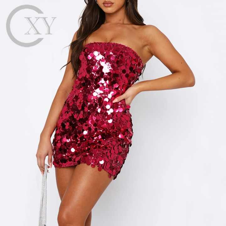มินิเดรสแขนกุดและไร้สายมีเทปจับและผ้าเลื่อม & ซิปที่มองไม่เห็น
