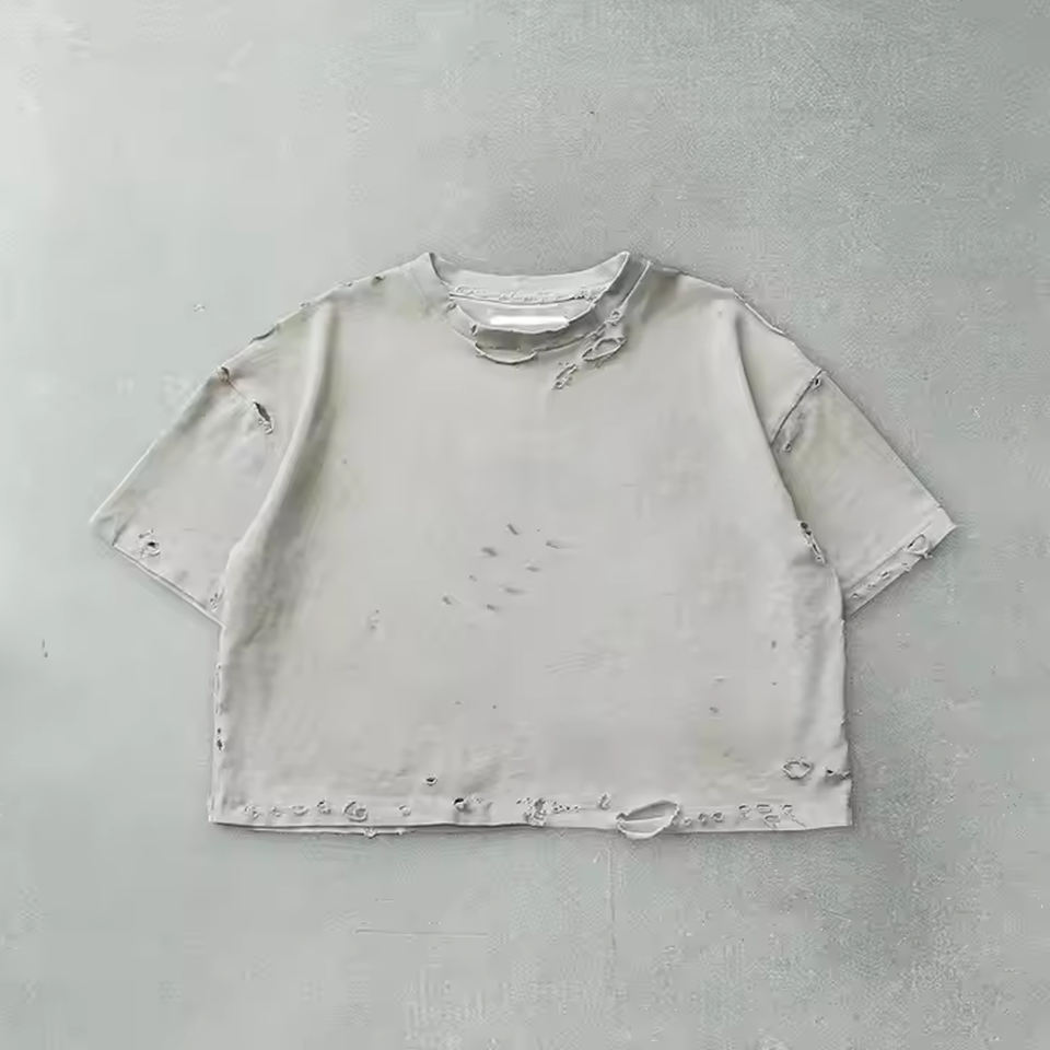 เสื้อยืดสตรีทแวร์ผู้ชายทรงหลวมเอวใหญ่สไตล์วินเทจแบบขาดๆ ซักสีซีด