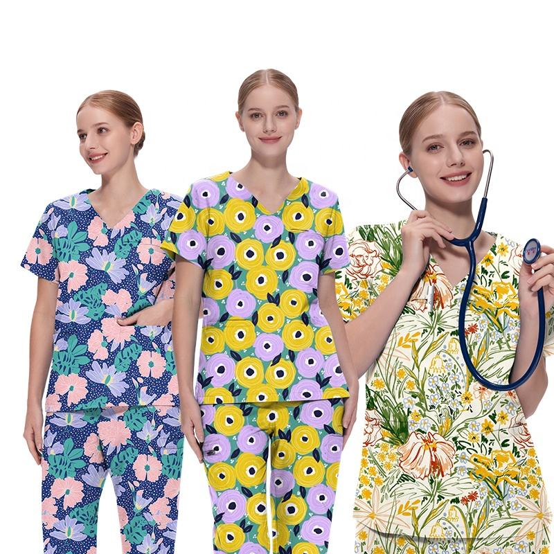 ชุดพยาบาลโรงพยาบาลผ้าฝ้ายสำหรับผู้หญิงผู้ชายชุดพยาบาลเสื้อทรงตรงคอวีพิมพ์ลายแบบกำหนดเอง