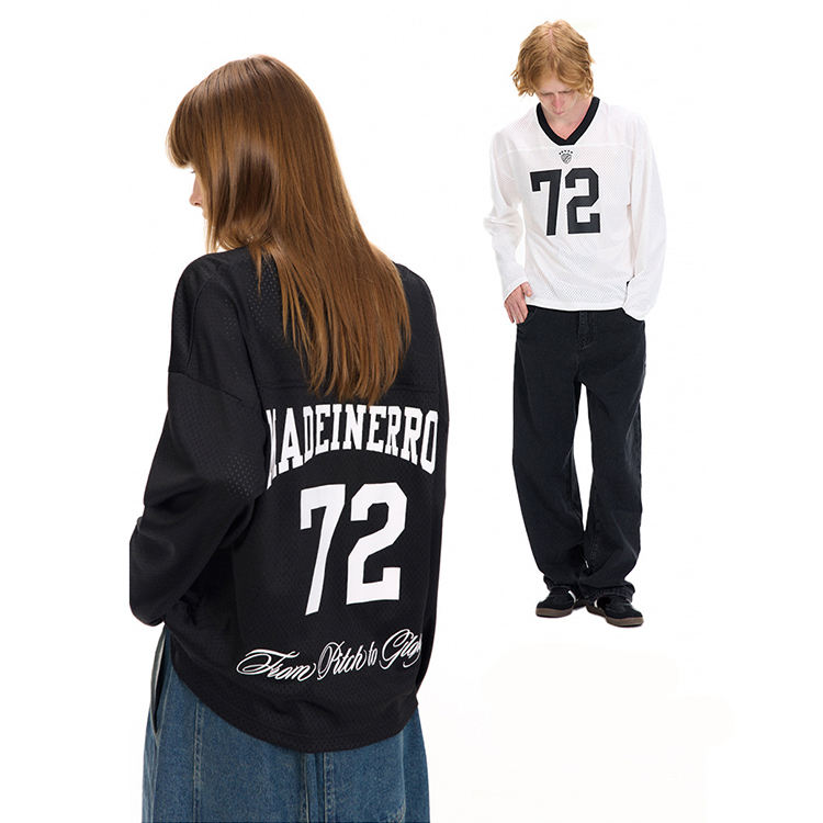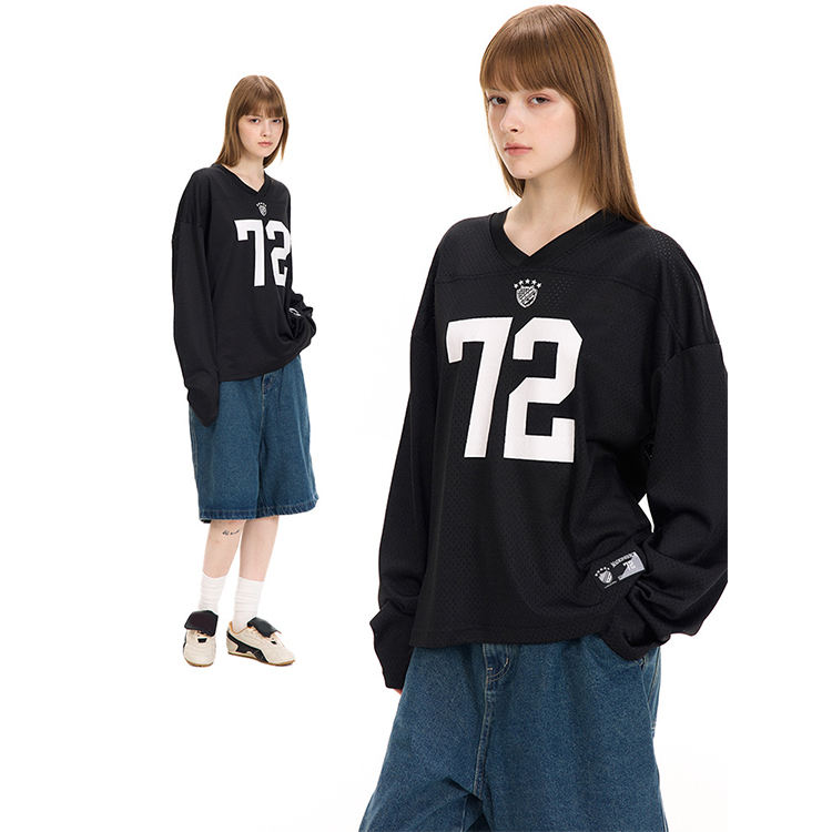 เสื้อฟุตบอลสไตล์อเมริกันเรโทรทรงโอเวอร์ไซส์แบบสั่งตัดพิเศษ ผ้าฝ้าย 100% ระบายอากาศได้ดี คอวี แขนยาว ไซส์พลัส สำหรับฤดูใบไม้ร่วง แบบยูนิเซ็กส์
