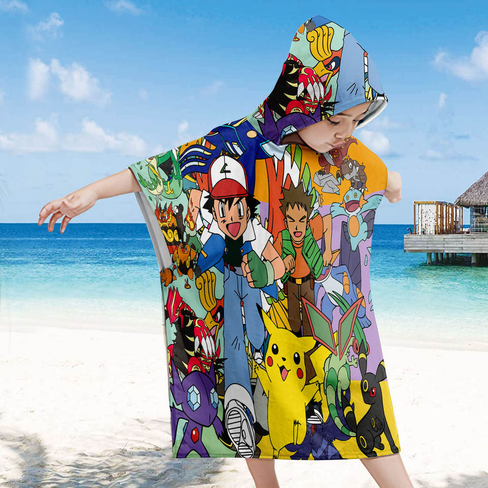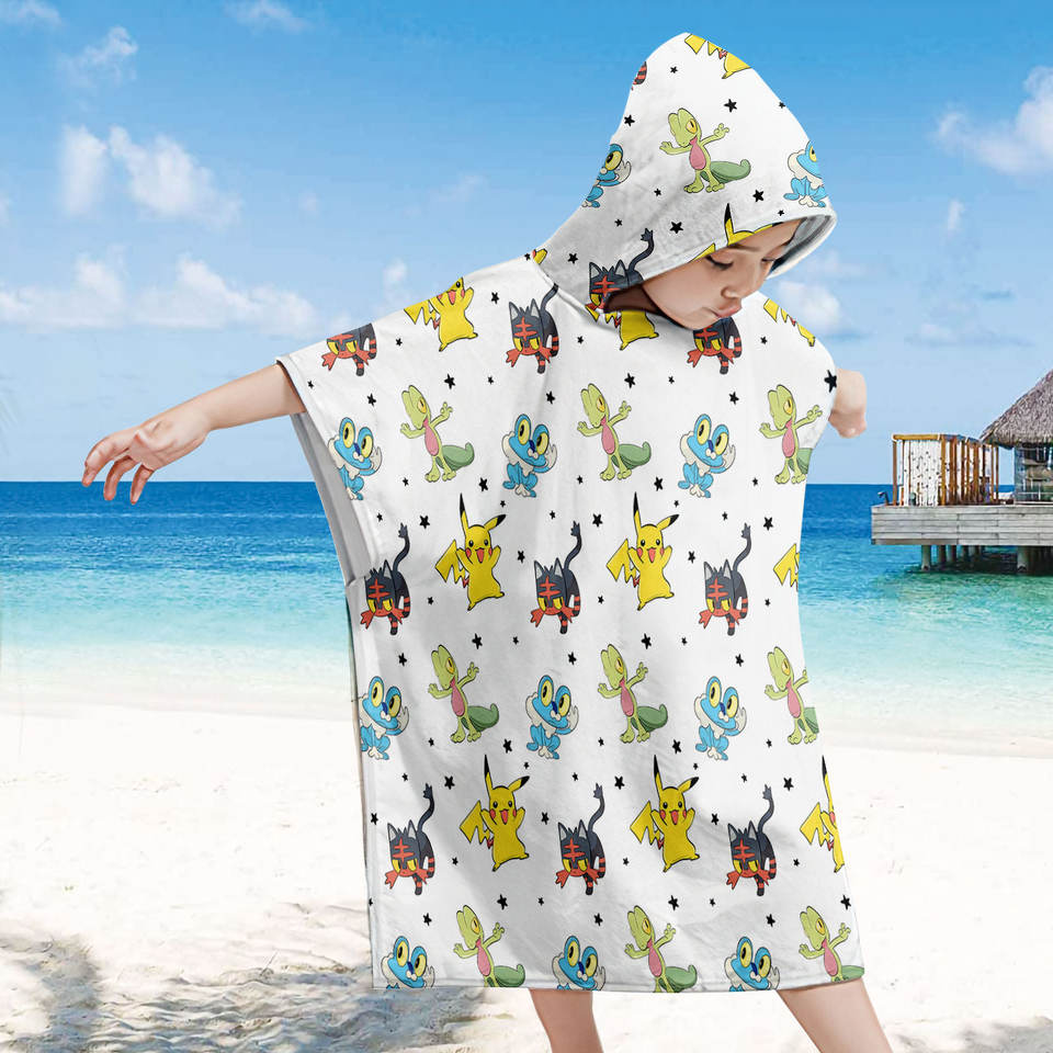 ผ้าขนหนูคลุมอาบน้ำเด็กแบบมีฮู้ดลายการ์ตูนโปเกมอนน่ารัก ผ้าขนหนูออร์แกนิคเนื้อนุ่มซึมซับน้ำได้ดีสำหรับเด็ก