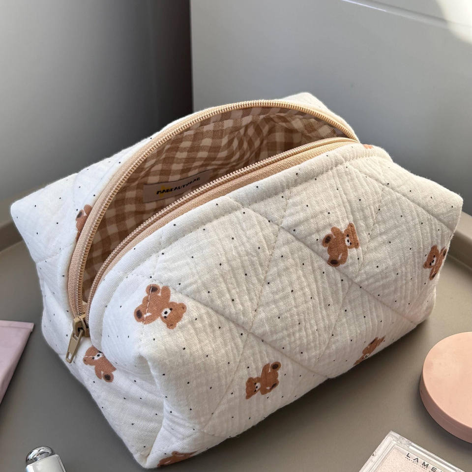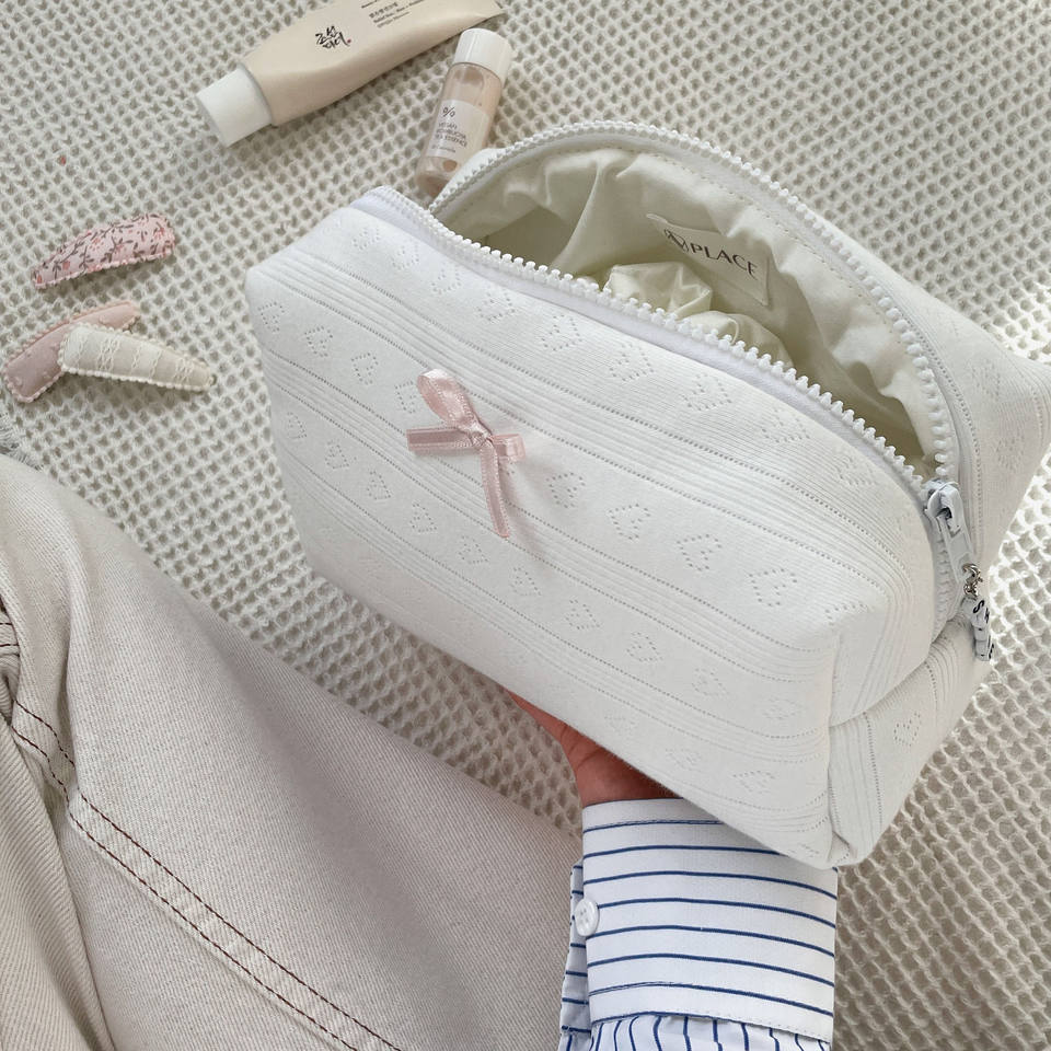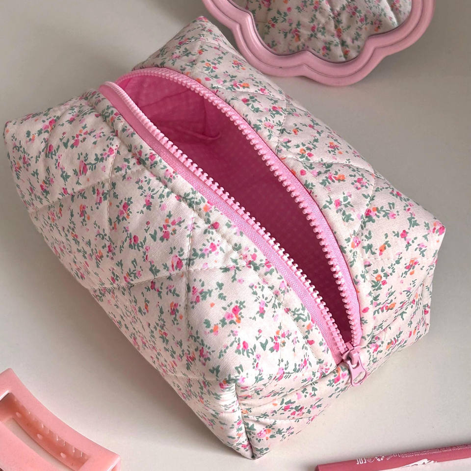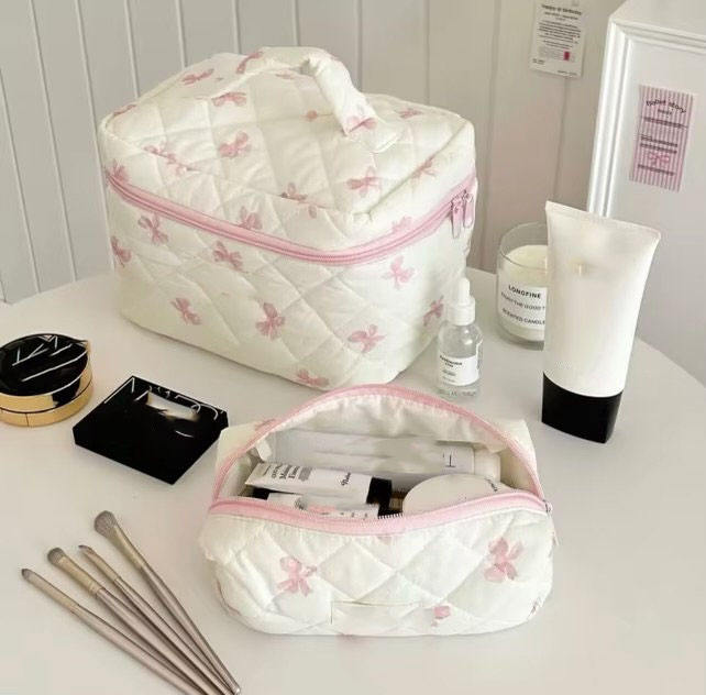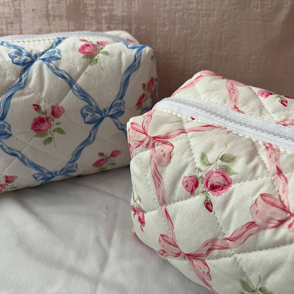 กระเป๋าเครื่องสำอางปักลายดอกไม้สีชมพูน่ารักแบบสั่งทำพิเศษ กระเป๋าใส่เครื่องสำอางแบบ Coquette พร้อมผ้าเช็ดตัวและซับในลายตาราง