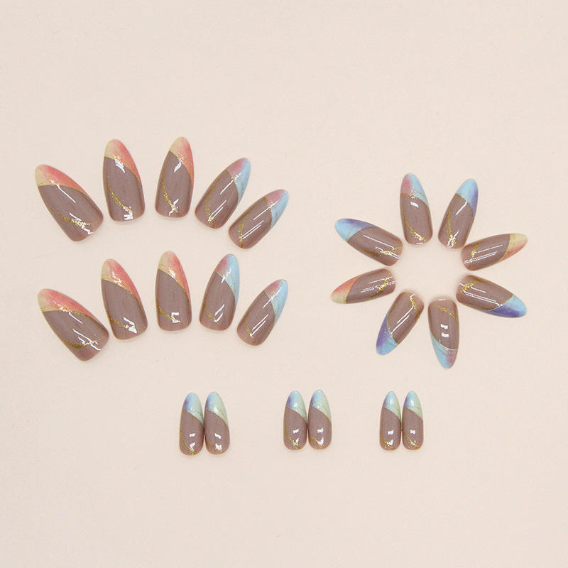 เล็บปลอมดีไซน์เอง ลายไล่สีชมพูอัลมอนด์ เคลือบเงาแบบเลเซอร์ ติดง่าย