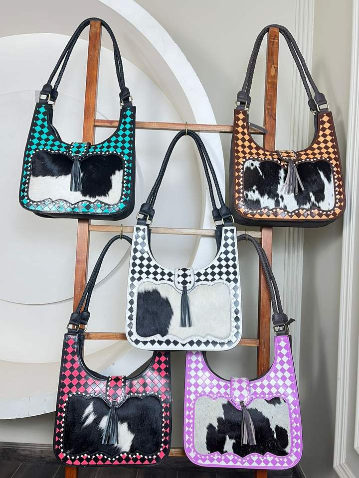 กระเป๋าสะพายไหล่หนังแท้ลายตารางหมากรุกทำมือสำหรับผู้หญิง