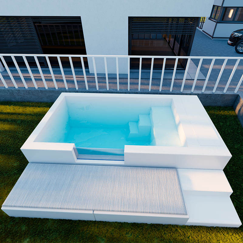 สระว่ายน้ำสำเร็จรูปไฟเบอร์กลาสแบบกำหนดเองสำหรับครอบครัว รีสอร์ทบ้านพักตากอากาศ พร้อมโซฟาเลานจ์สำหรับผู้ใหญ่และเด็ก