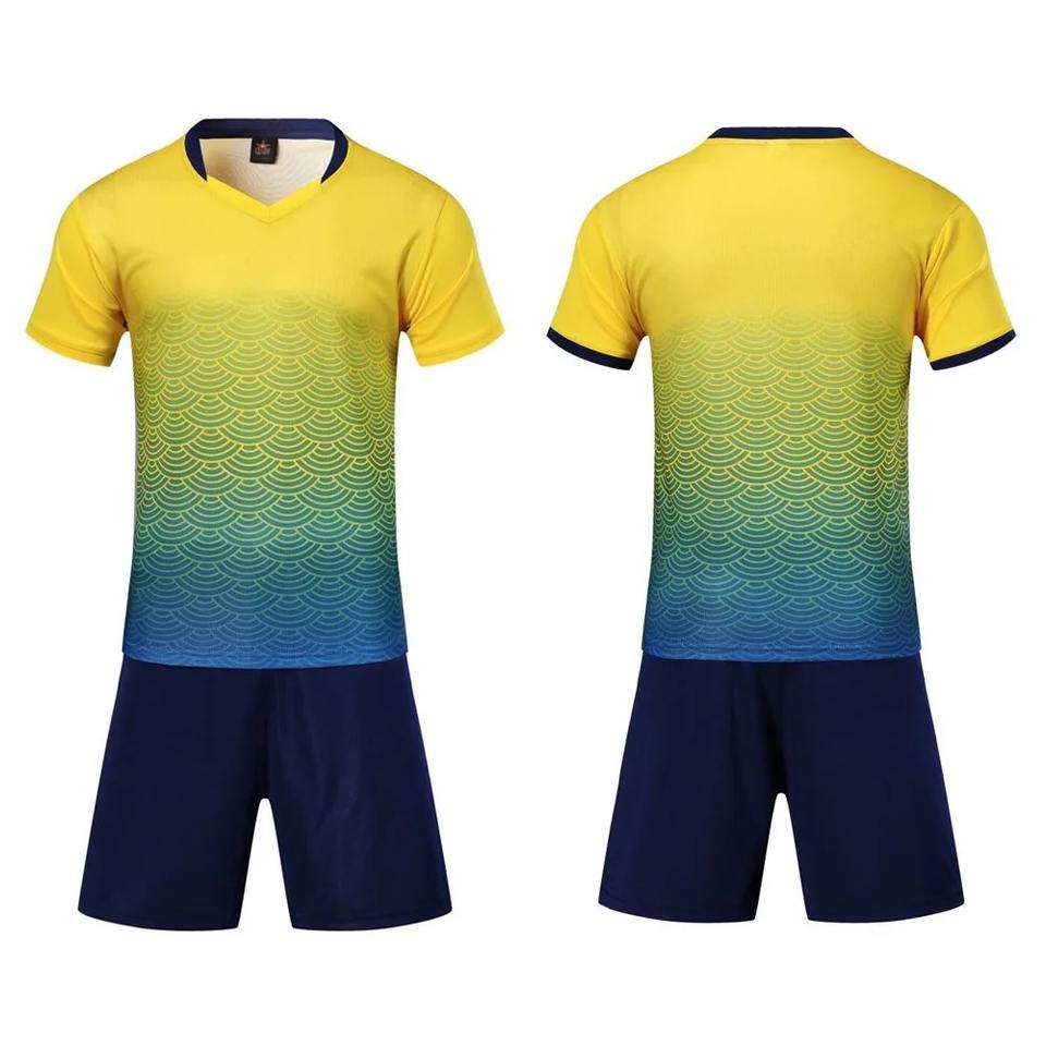 ชุดฟุตบอลแขนสั้นผู้ชายแบบออกแบบเอง ชุดยูนิฟอร์มฟุตบอลผู้ใหญ่ เสื้อฟุตบอลเด็กสีน้ำเงิน โลโก้แบบกำหนดเอง