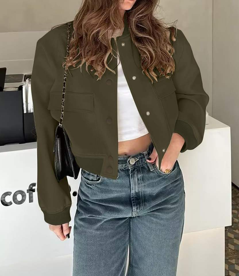 เสื้อโค้ทลำลองติดกระดุมแขนยาวของผู้หญิงเสื้อโค้ทลำลองมีกระเป๋าเสื้อแจ็คเก็ตบอมเบอร์เสื้อโค้ทฤดูใบไม้ร่วงดีไซน์ตามสั่ง