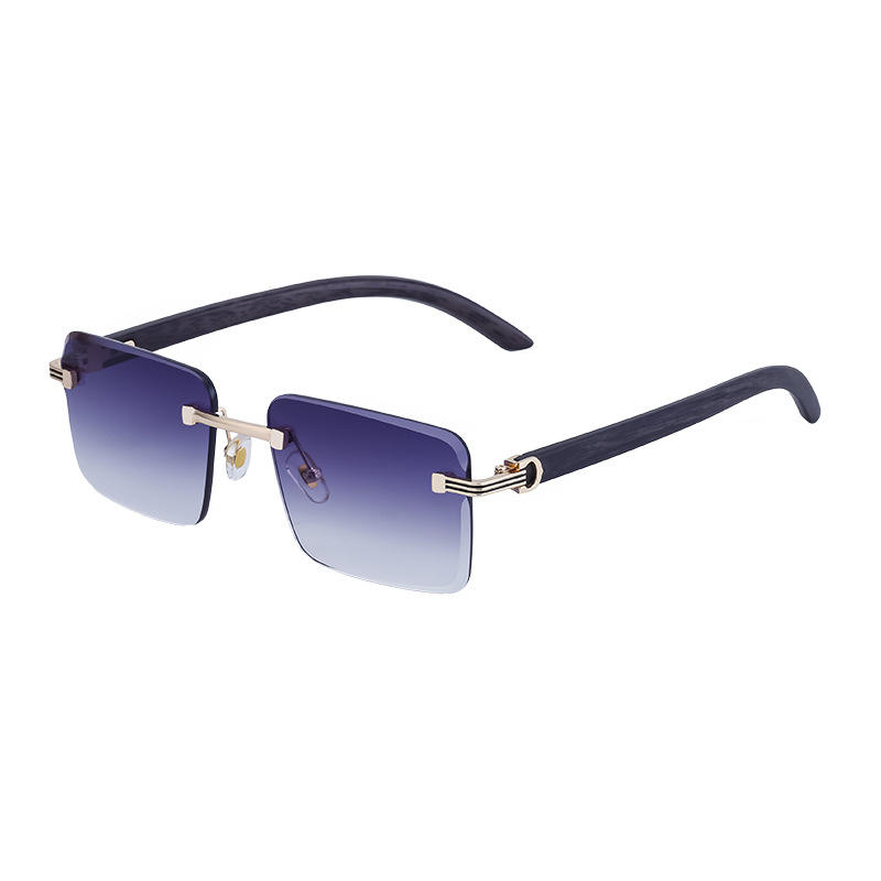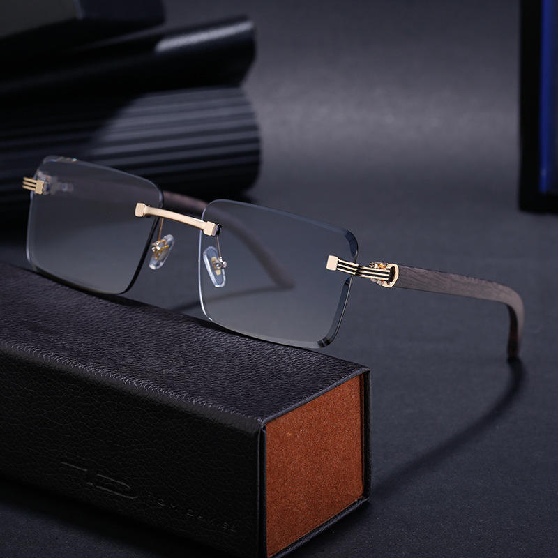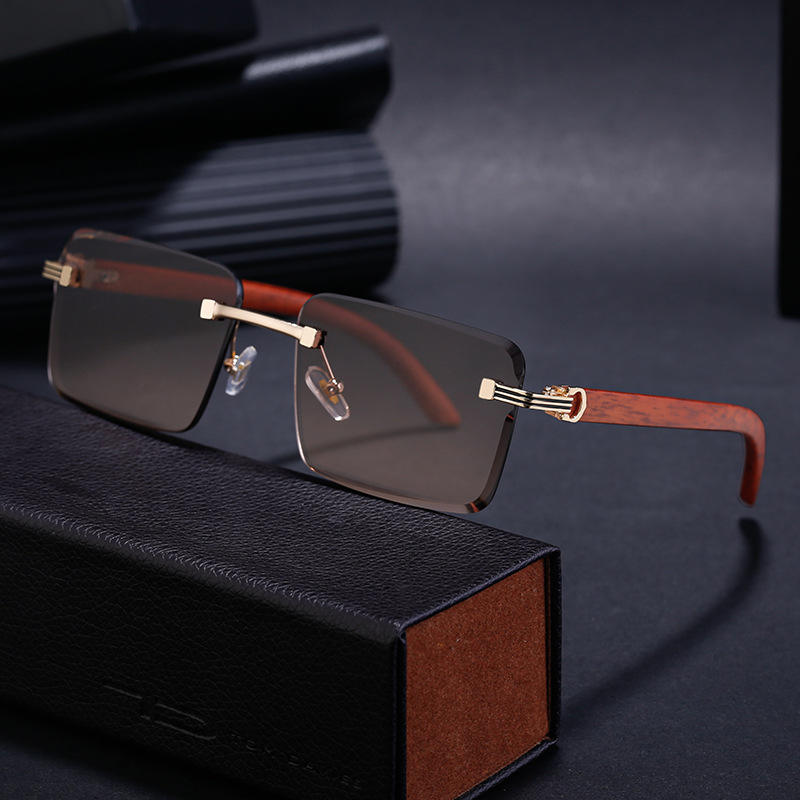 แว่นกันแดดทรงไร้กรอบแบบสั่งทำพิเศษสำหรับผู้ชาย เลนส์พีซีสีดำ ป้องกันรังสียูวี 400 น้ำหนักเบา ขาแว่นลายไม้ สไตล์อินสตาแกรม