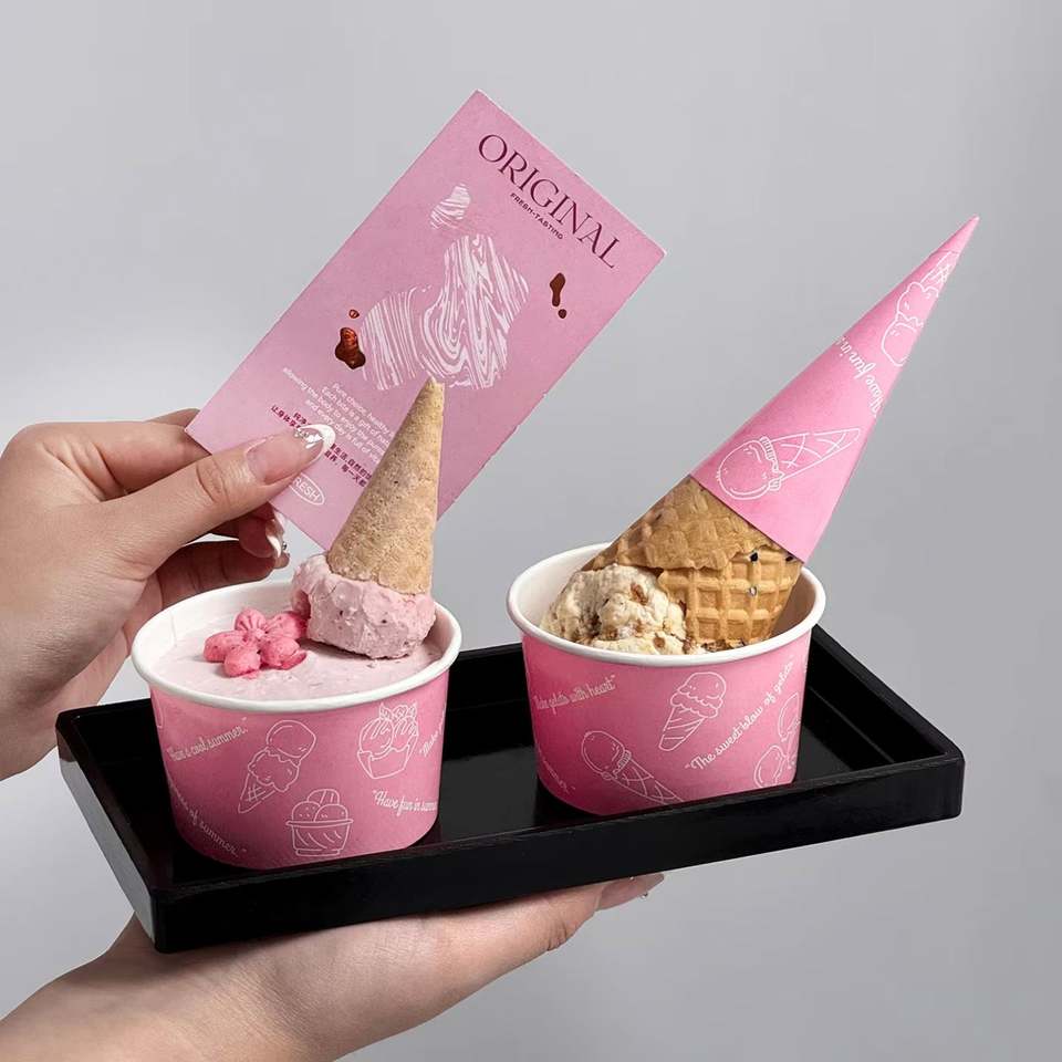 ถ้วยกระดาษไอศกรีมแบบใช้แล้วทิ้งที่ปรับแต่งได้ บรรจุภัณฑ์ไอศกรีมและไอติมแท่ง ถ้วยกระดาษ โคนไอศกรีม และถาดกระดาษ