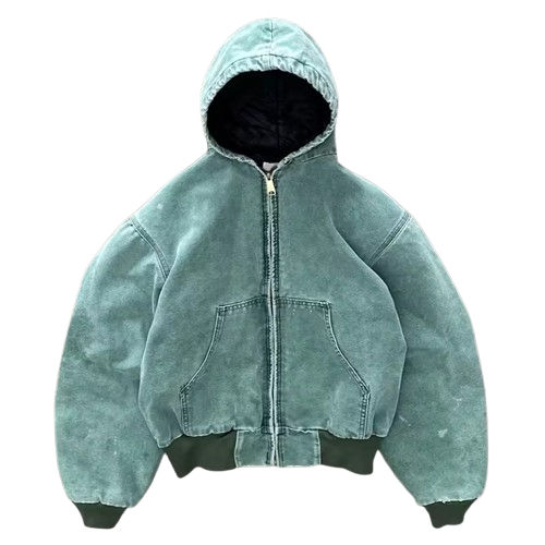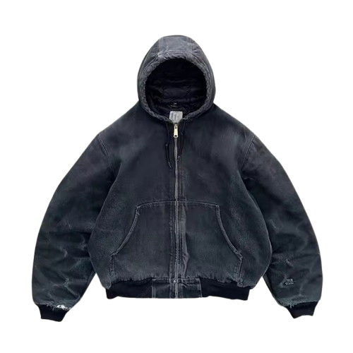 เสื้อสเวตเตอร์แต่งลายริ้วพร้อมฮู้ดแบบรูดซิปมีฮู้ดผ้ายีนส์มีรอยซีดจางและซักกรดสำหรับสวมใส่บนถนน
