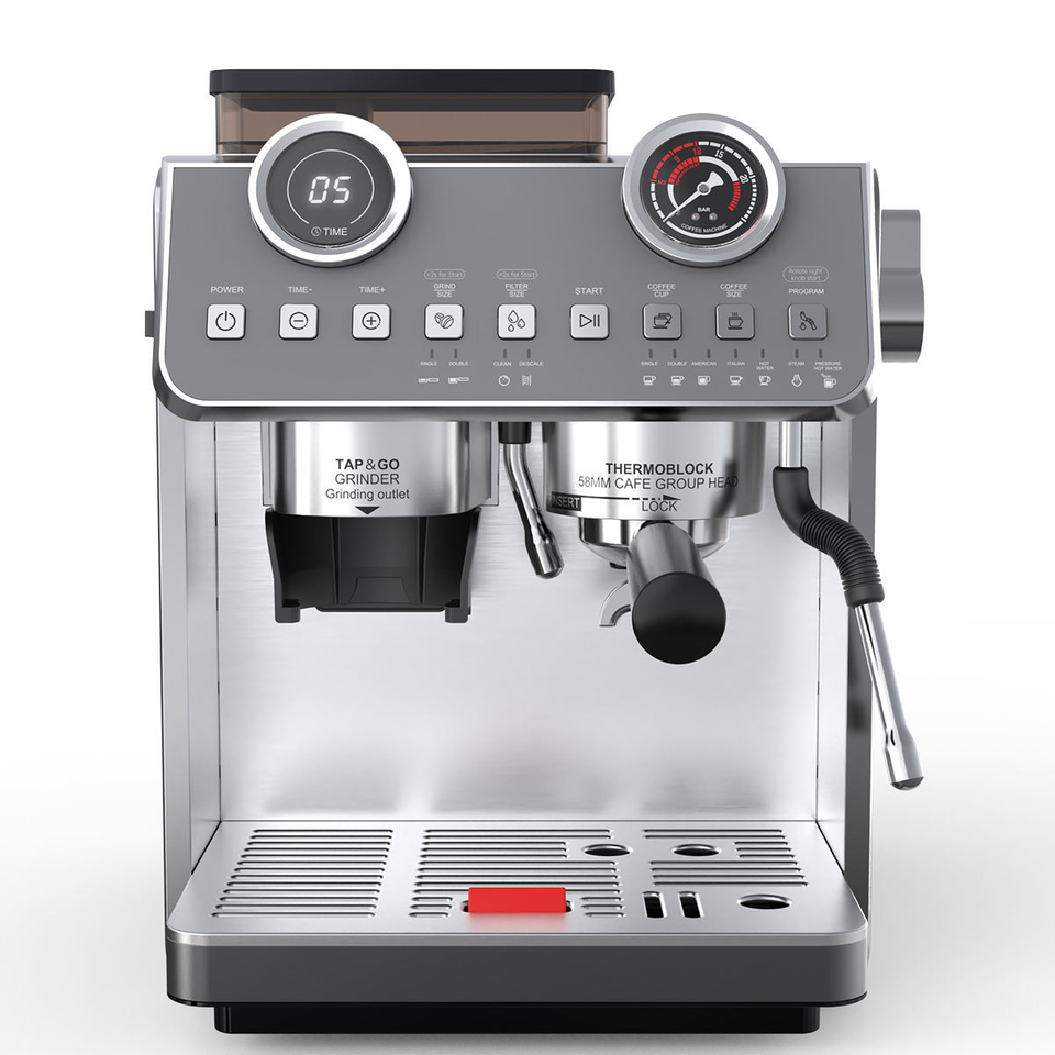 เครื่องชงกาแฟแบบคู่หม้อต้ม สำหรับใช้ในโรงแรม แบบไฟฟ้า แรงดัน 20 บาร์ ความจุ 2.7 ลิตร พร้อมเครื่องบดในตัว ทำจากสแตนเลส
