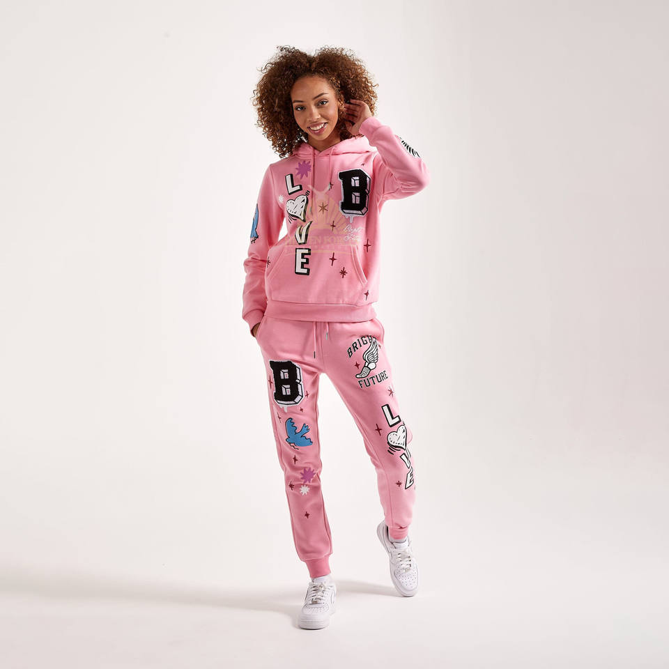 ชุดกันหนาวผ้าฝ้ายผ้าฟลีซ2ชิ้นมีฮู้ดสำหรับผู้หญิงเสื้อกันหนาวแบบสวมหัวผ้าคอตตอนฟลีซเทอร์รี่320gsm สำหรับฤดูหนาวออกแบบได้ตามต้องการ
