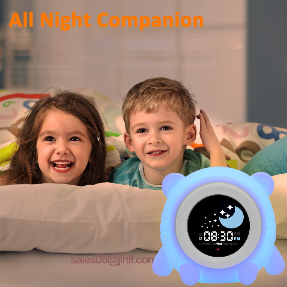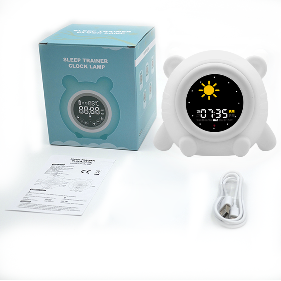 การแสดงออกที่กําหนดเองการศึกษาการสอนการเรียนรู้เทรนเนอร์การนอนหลับของเด็กพร้อมไฟกลางคืนและเครื่องเสียงนาฬิกาตั้งโต๊ะ LED