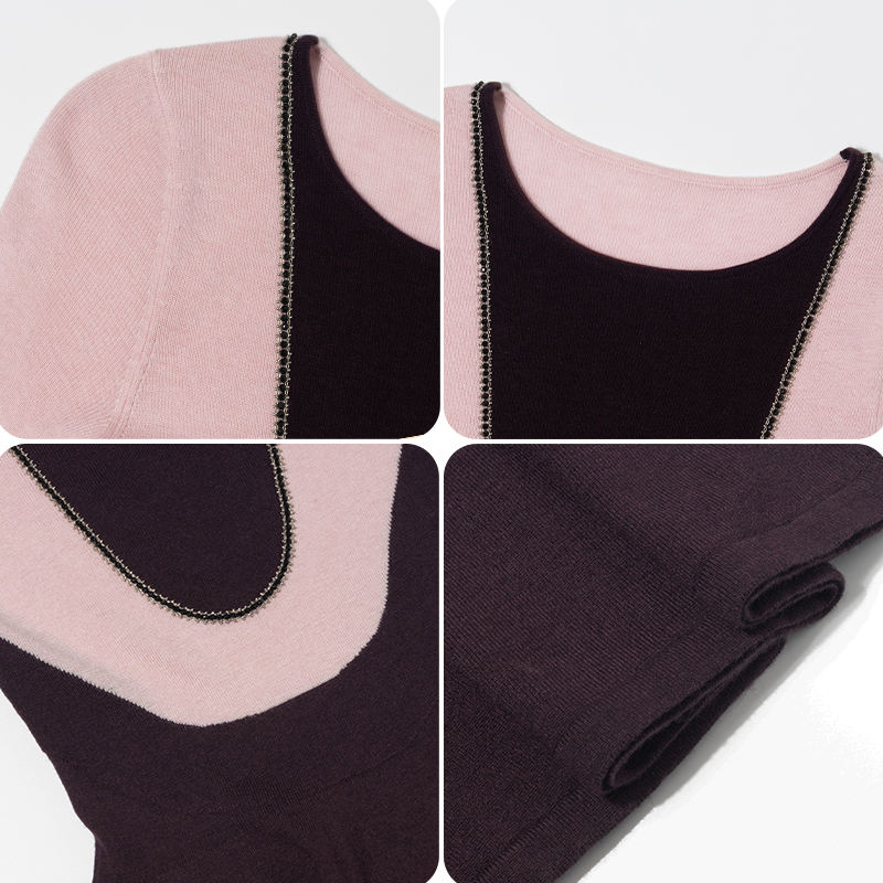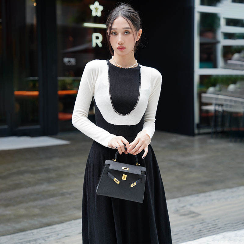เดรสผ้าถักสำหรับผู้หญิงรุ่นยาวทูโทนเอวเรียวยาวแฟชั่นกำหนดเองได้แบบลำลองมีสไตล์สำหรับฤดูใบไม้ร่วง