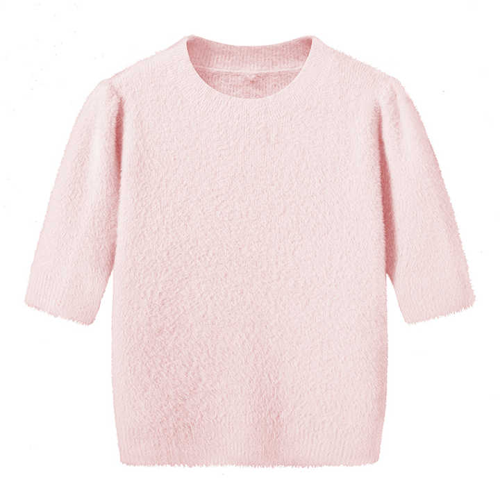 สเวตเตอร์ถักสำหรับผู้หญิงผ้าวูลแขนสั้นคอกลมทรงหลวมลำลองแฟชั่นตามสั่งฤดูร้อน