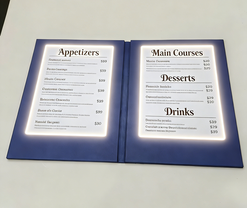 เมนูหนังเทียมแบบกำหนดเองพร้อมไฟ LED สองหน้า ที่ใส่เมนูแบบมีไฟ LED แบบชาร์จไฟได้