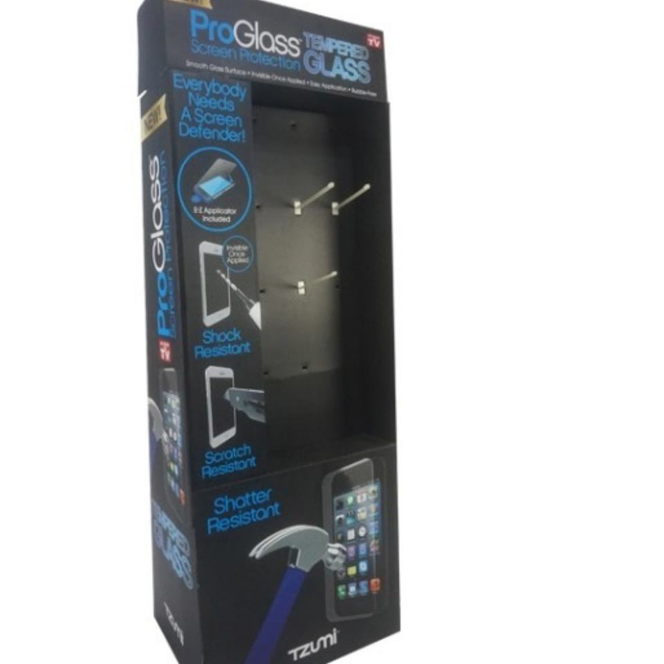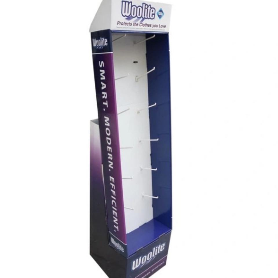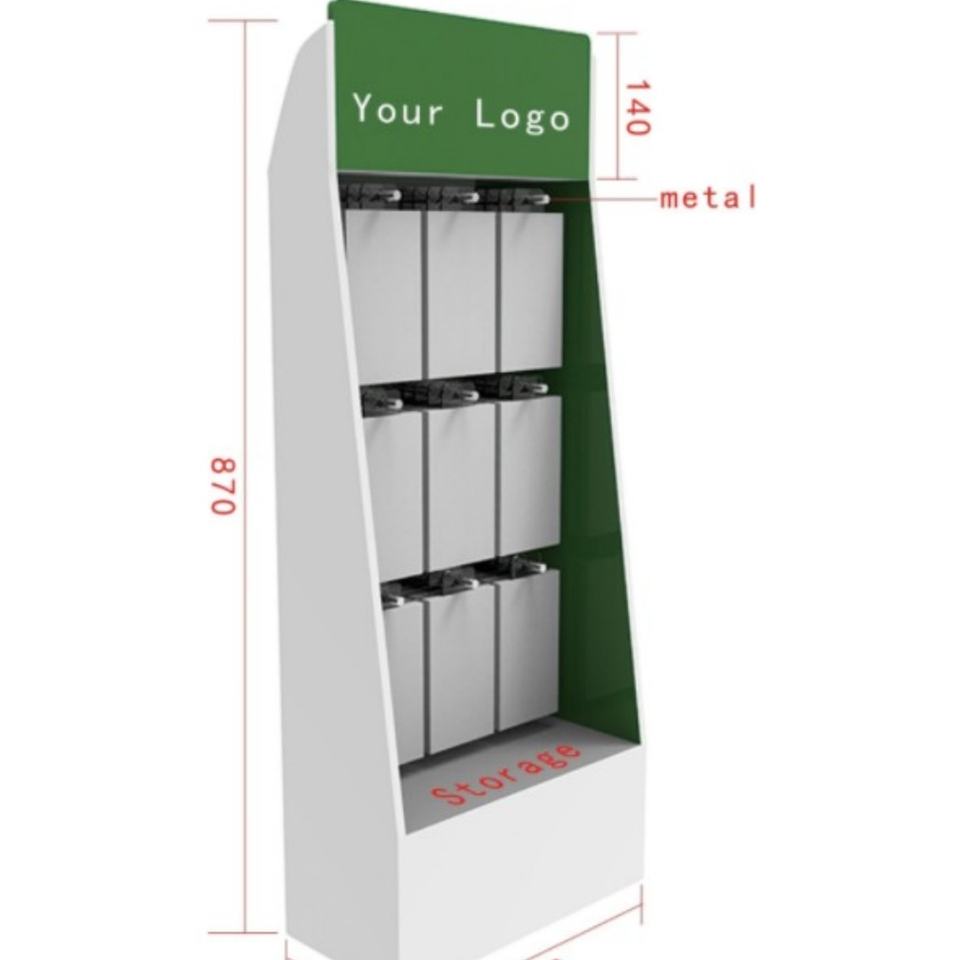 ขาตั้งโชว์สินค้าแบบตั้งพื้นสำหรับผ้าพันคอ แบบกำหนดเองได้ วัสดุแผ่นลูกฟูก พร้อมแผงเพ็กบอร์ด และตะขอแขวน