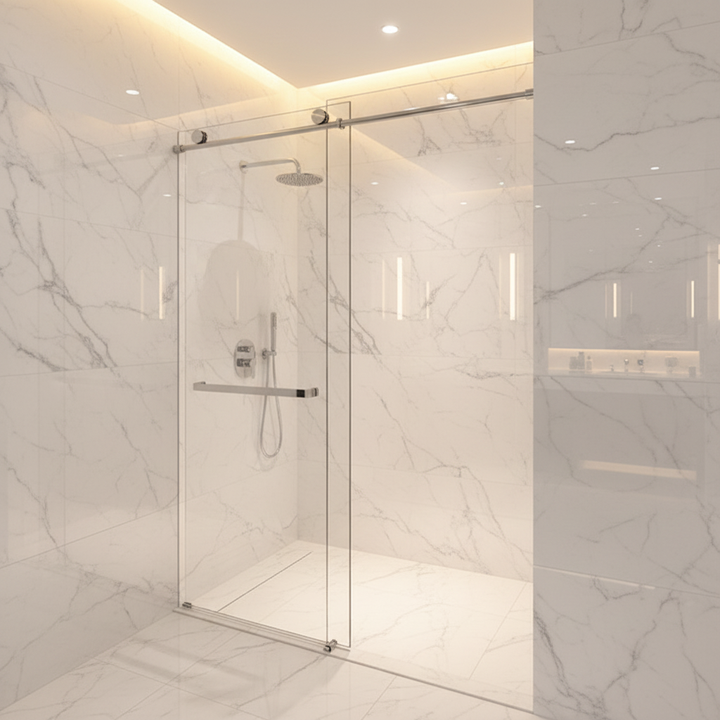 ห้องอาบน้ำแบบไม่มีกรอบสั่งทำพิเศษ กระจกนิรภัยหนา 8 มม. ประตูบานเลื่อน 1 บาน ประตูบานคงที่ 1 บาน ระบบปิดแบบนุ่มนวล กันน้ำ สำหรับห้องน้ำในบ้าน