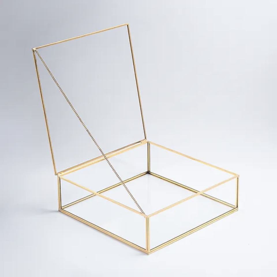 ที่กําหนดเองโลหะทองกรอบทองเหลืองแก้วใสเครื่องประดับอุปกรณ์เสริมตกแต่งช็อคโกแลตกล่องรูปสําหรับตกแต่งบ้าน