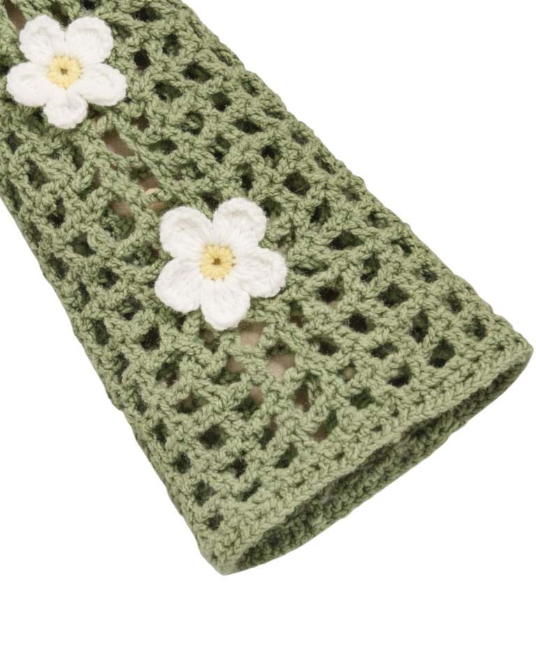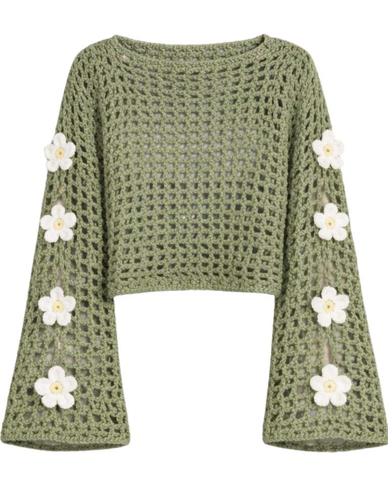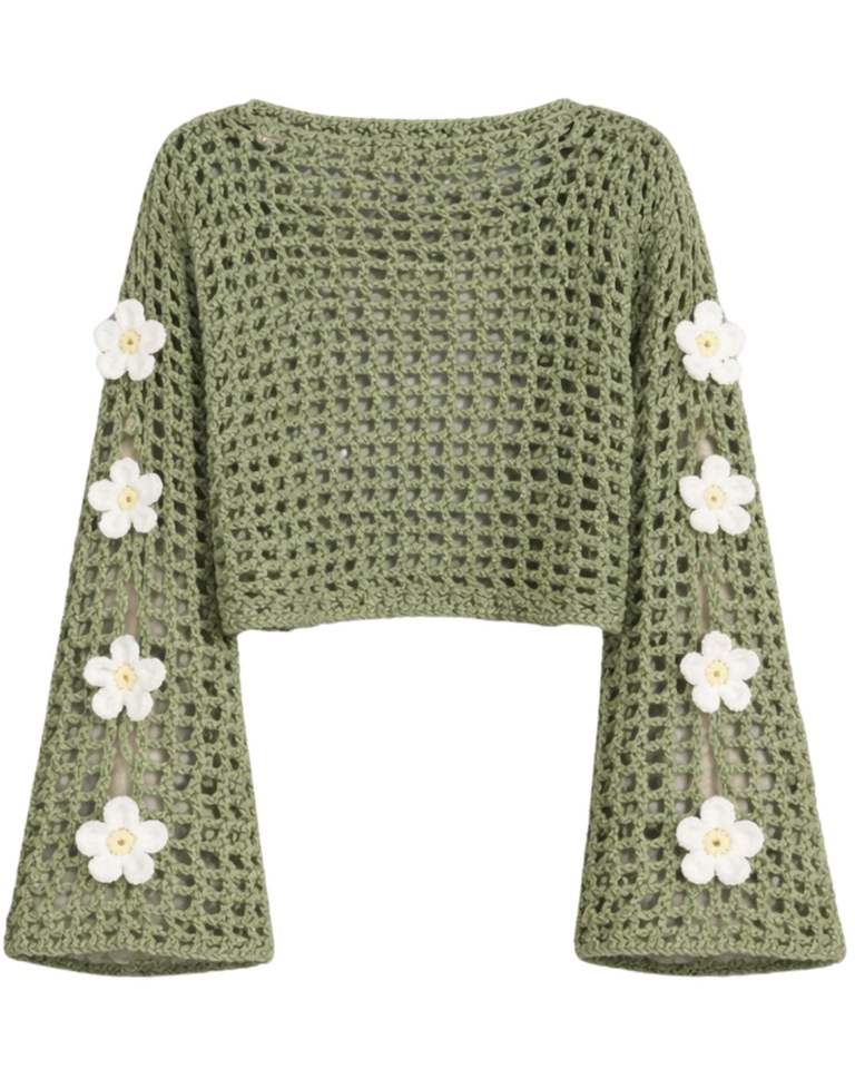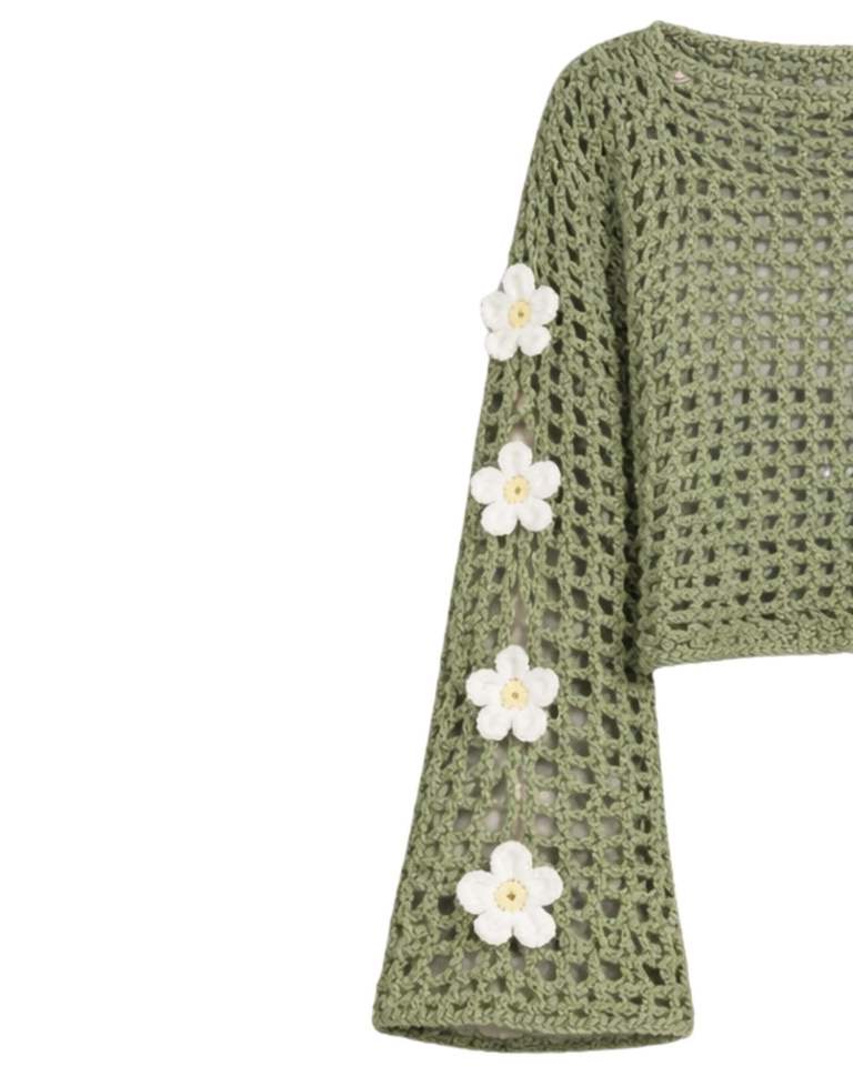 Customized Green Crochet Knit Crop Sweater Women Floral Applique Flare Sleeve Open Weave Lightweight Fashion Top Spring Summer