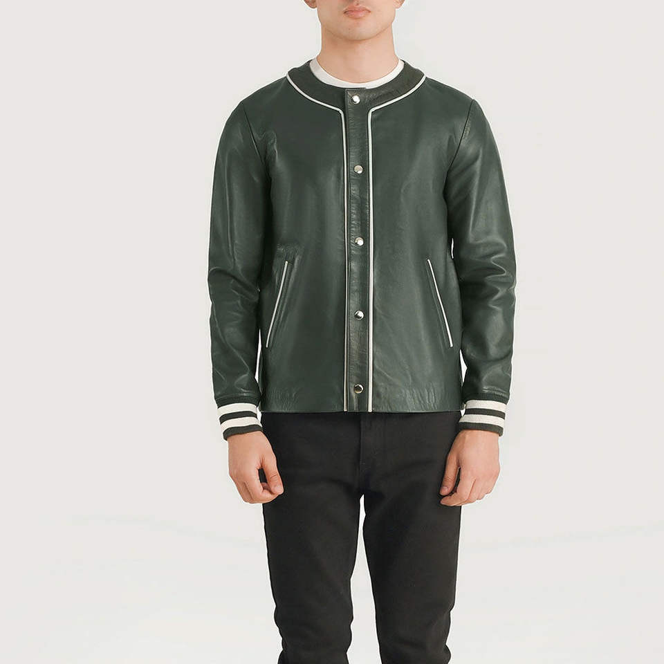 แจ็คเก็ตหนังแท้สีเขียวแบบกำหนดเองสำหรับผู้ชาย สไตล์วินเทจสำหรับขี่มอเตอร์ไซค์ คอตั้ง มีทุกขนาด พร้อมป้ายโลโก้แบบกำหนดเอง