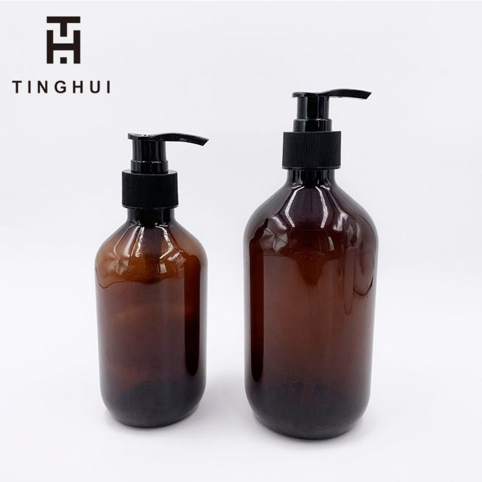 ขวดพลาสติก PET สีเขียวเทาใส ขนาด 300 มล. 500 มล. สำหรับบรรจุน้ำมันใส่ผม โลชั่น แชมพู พร้อมหัวปั๊มสีดำ แบบกำหนดเองได้