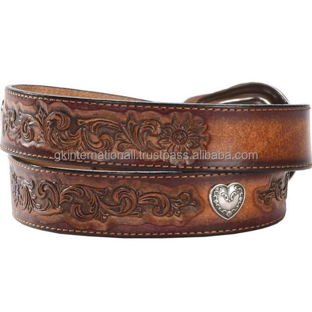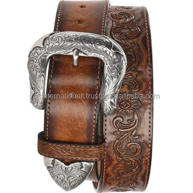 เข็มขัดหนังสไตล์ตะวันตกสำหรับผู้ชายและผู้หญิง Conchos ลายใบไม้แกะสลักด้วยมือออกแบบได้ตามต้องการ
