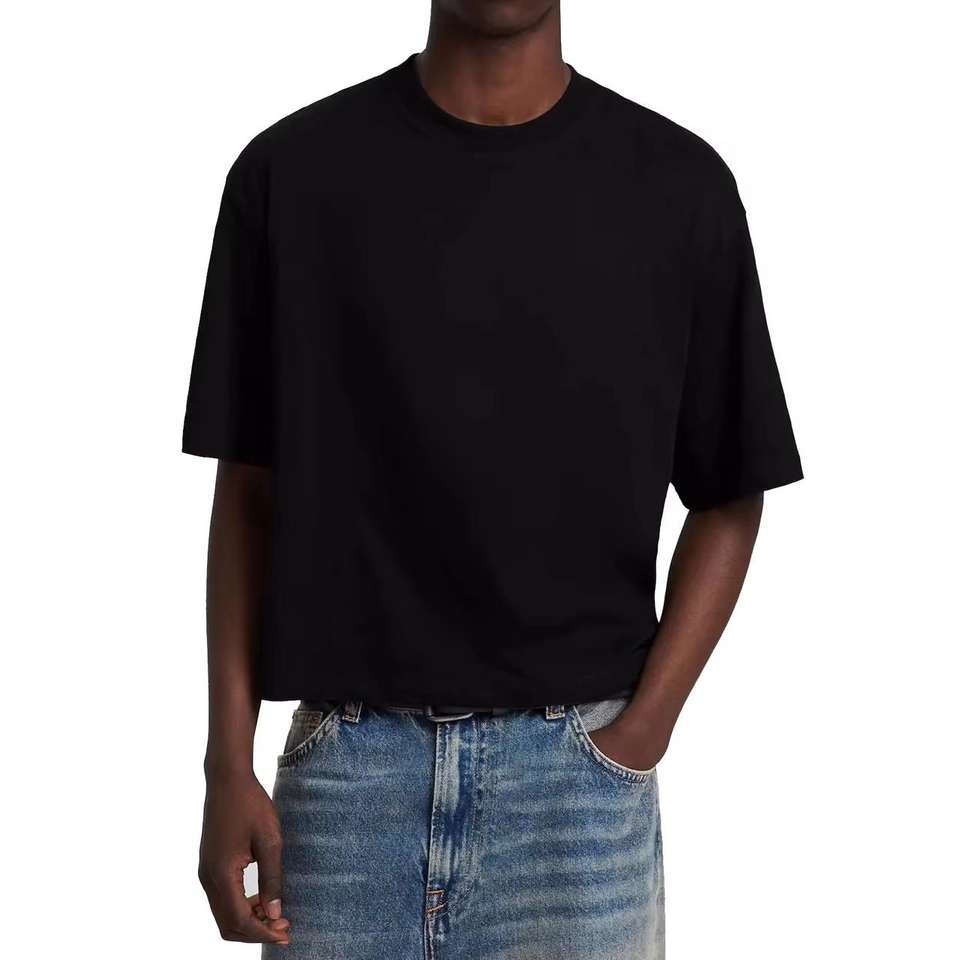 เสื้อยืดคอกลมทรงครอปสำหรับผู้ชาย ผ้าฝ้าย 100% หนานุ่ม สไตล์วินเทจ สีขาวดำ ตัดเย็บแบบไหล่ตก ทรงครอปท็อป ผ่านการซักแบบวอช