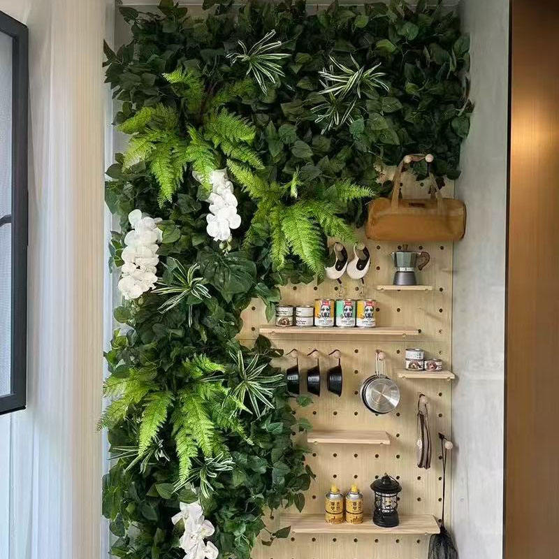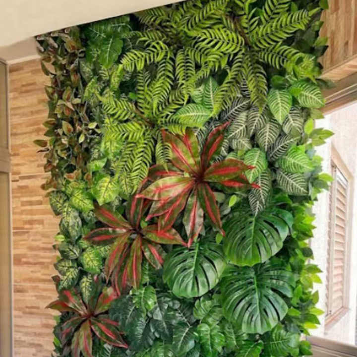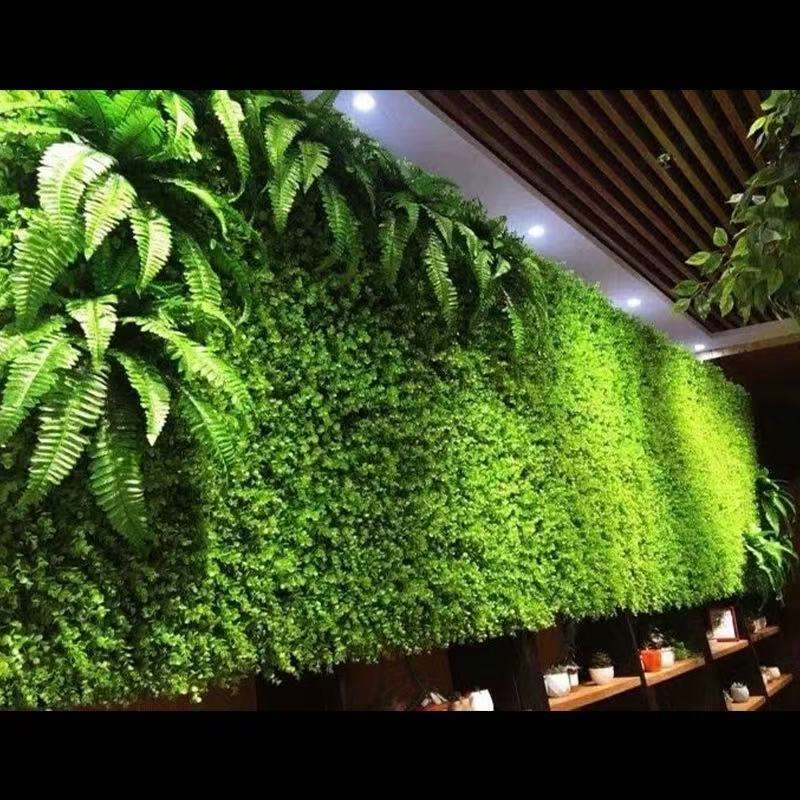 ผนังหญ้าเทียมคุณภาพสูงแบบกำหนดเองสำหรับตกแต่งระเบียงกลางแจ้งด้วยพื้นหลังต้นไม้สีเขียว