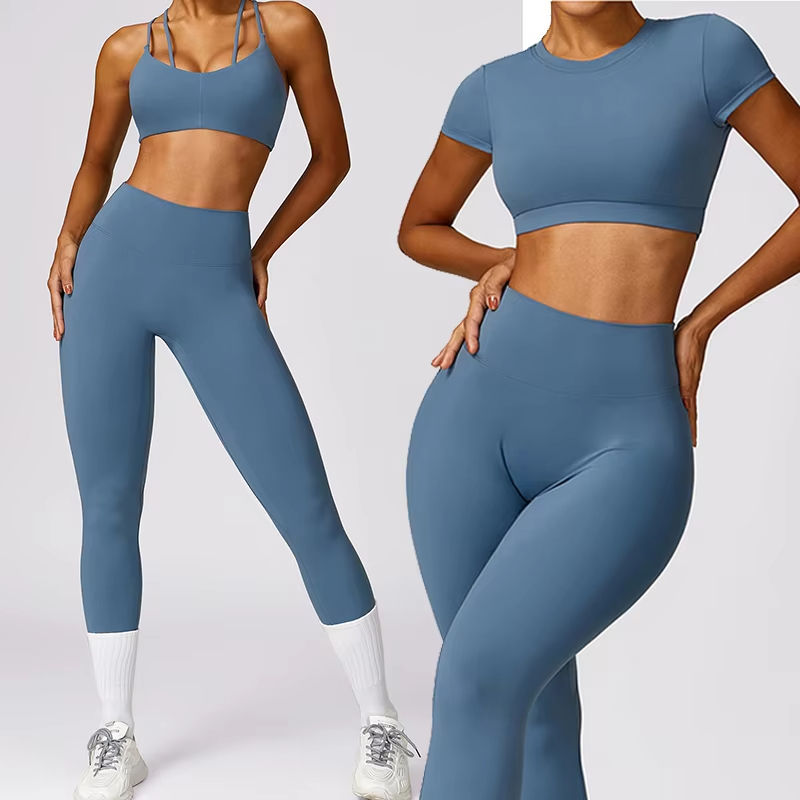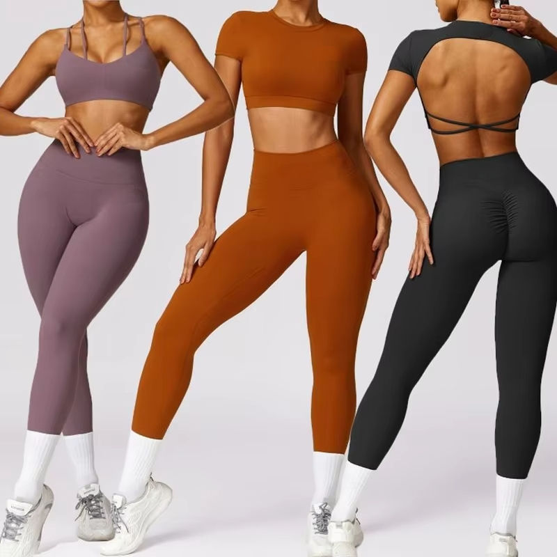 ชุดออกกำลังกายสำหรับผู้หญิงคุณภาพสูงแบบสั่งทำพิเศษ เสื้อผ้ากีฬาระบายอากาศไร้รอยต่อ กางเกงขาสั้นแบบเรียบ ชุดโยคะ