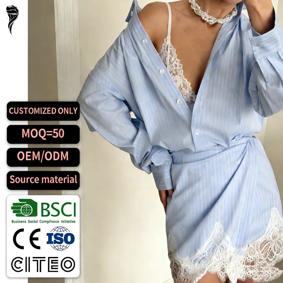 เดรสเชิ้ตสั่งตัดคุณภาพสูง คอวี แขนยาว ผ้าฝ้าย แต่งลูกไม้ ทรงมินิเดรส