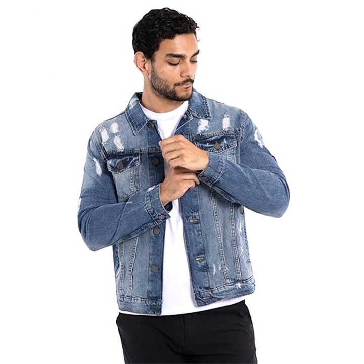 แจ็กเก็ตยีนส์สีน้ำเงินอ่อนแขนยาวพอดีตัวสำหรับผู้ชายแจ็คเก็ตยีนส์ซักในฤดูหนาวสไตล์ลำลองใหม่