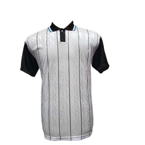 เสื้อยืดกีฬาลายทางคอวีพิมพ์ซับลิเมชันสำหรับผู้ชายเสื้อเจอร์ซีย์ฟุตบอลเสื้อย้อนยุคสำหรับผู้ชาย
