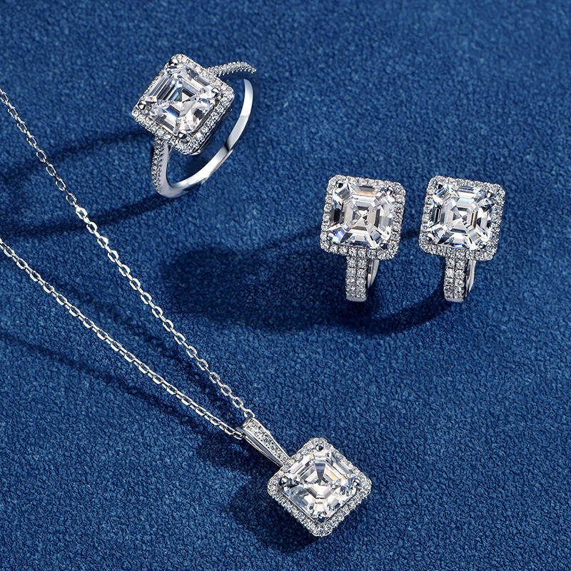 ชุดเครื่องประดับแฟชั่นสำหรับผู้หญิงคุณภาพสูงงานตามสั่งต่างหูสร้อยคอขนาดเส้นผ่านศูนย์กลางเต็มรูปแบบสำหรับของขวัญแต่งงานแหวนหมั้นเพทาย