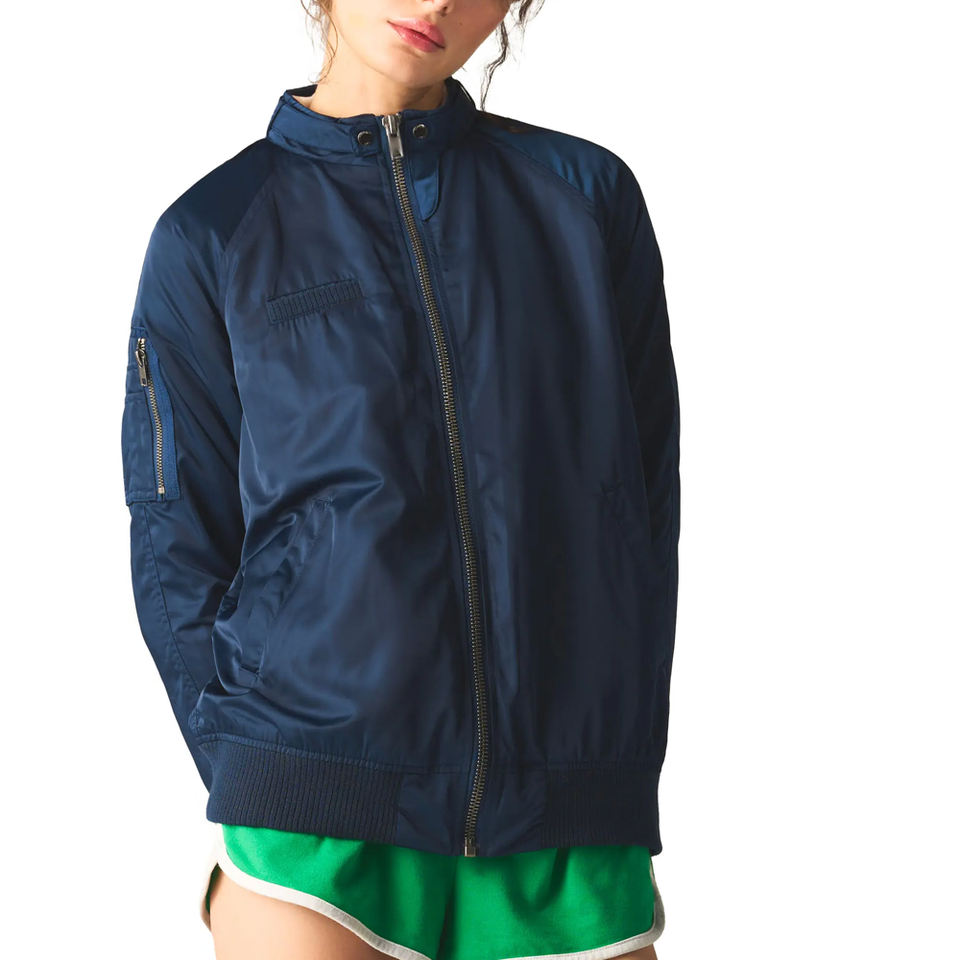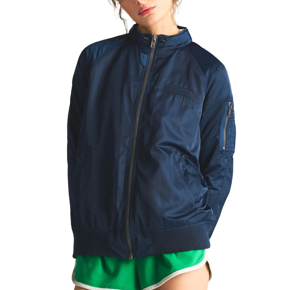 แจ็คเก็ตบอมเบอร์ผ้าซาตินคุณภาพสูงสำหรับผู้หญิง ตกแต่งด้วยหนังแกะ ผ่านการผลิตอย่างเป็นมิตรต่อสิ่งแวดล้อมและกันน้ำ