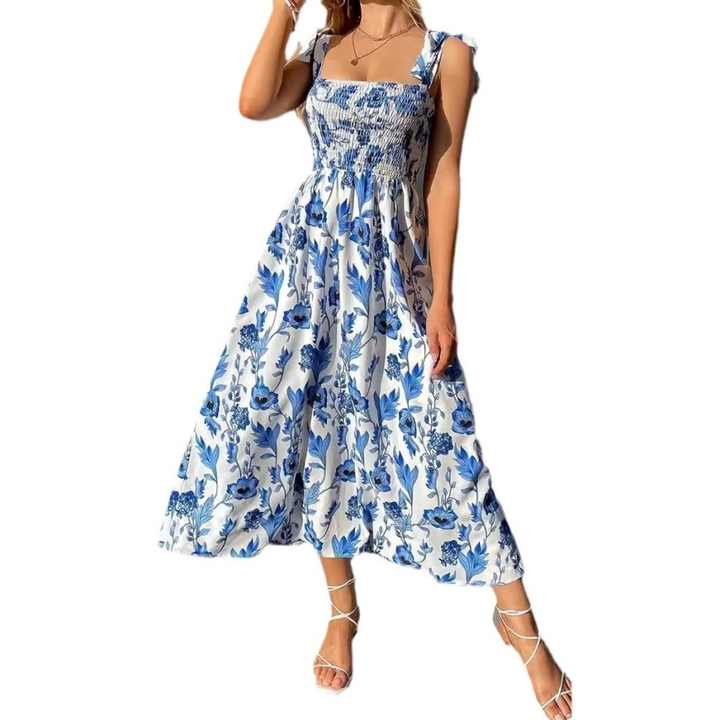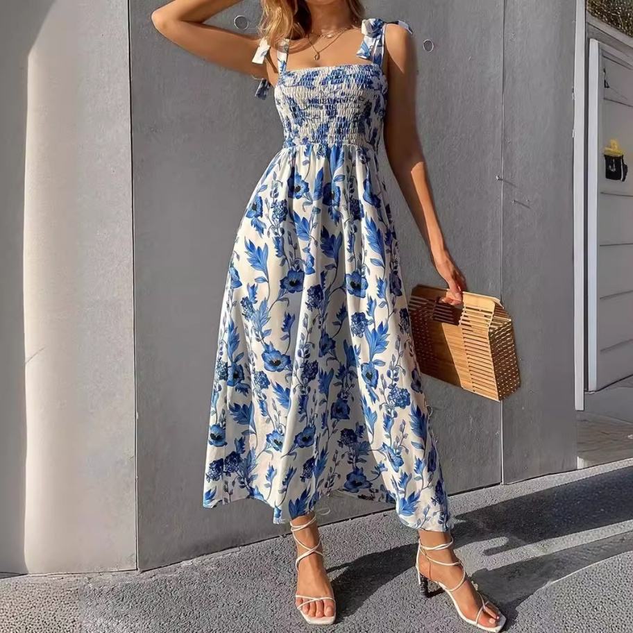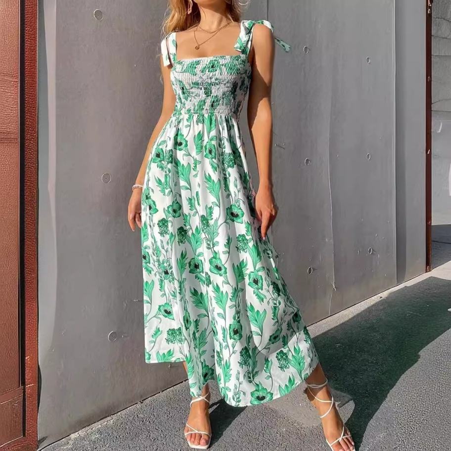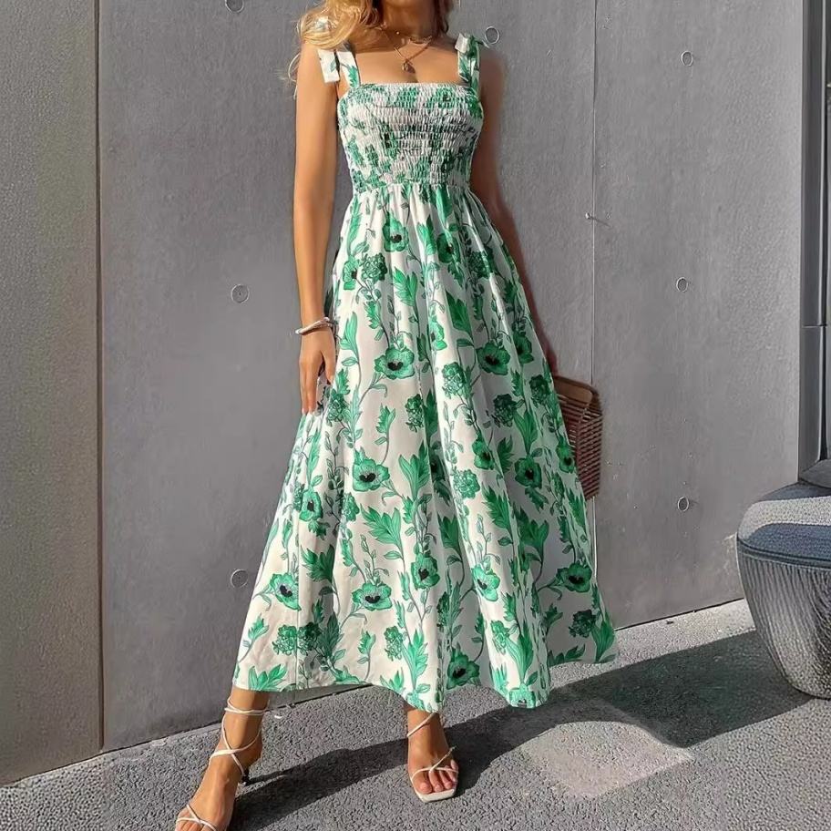 ชุดเดรสสไตล์โบฮีเมียนวินเทจลายดอกไม้พิมพ์ลายชนเผ่าคุณภาพสูงแบบสั่งทำพิเศษสำหรับผู้หญิง แขนกุด คอ halter ความยาวปานกลาง สไตล์ลำลอง 100%