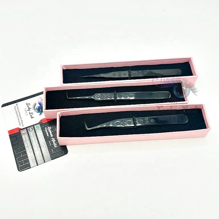 ที่หนีบขนตาแบบบางทำจากสเตนเลสสตีลสำหรับต่อขนตาแบบโค้งงอได้90องศาฉลากตามสั่งสีดำดีไซน์รูปหัวใจ