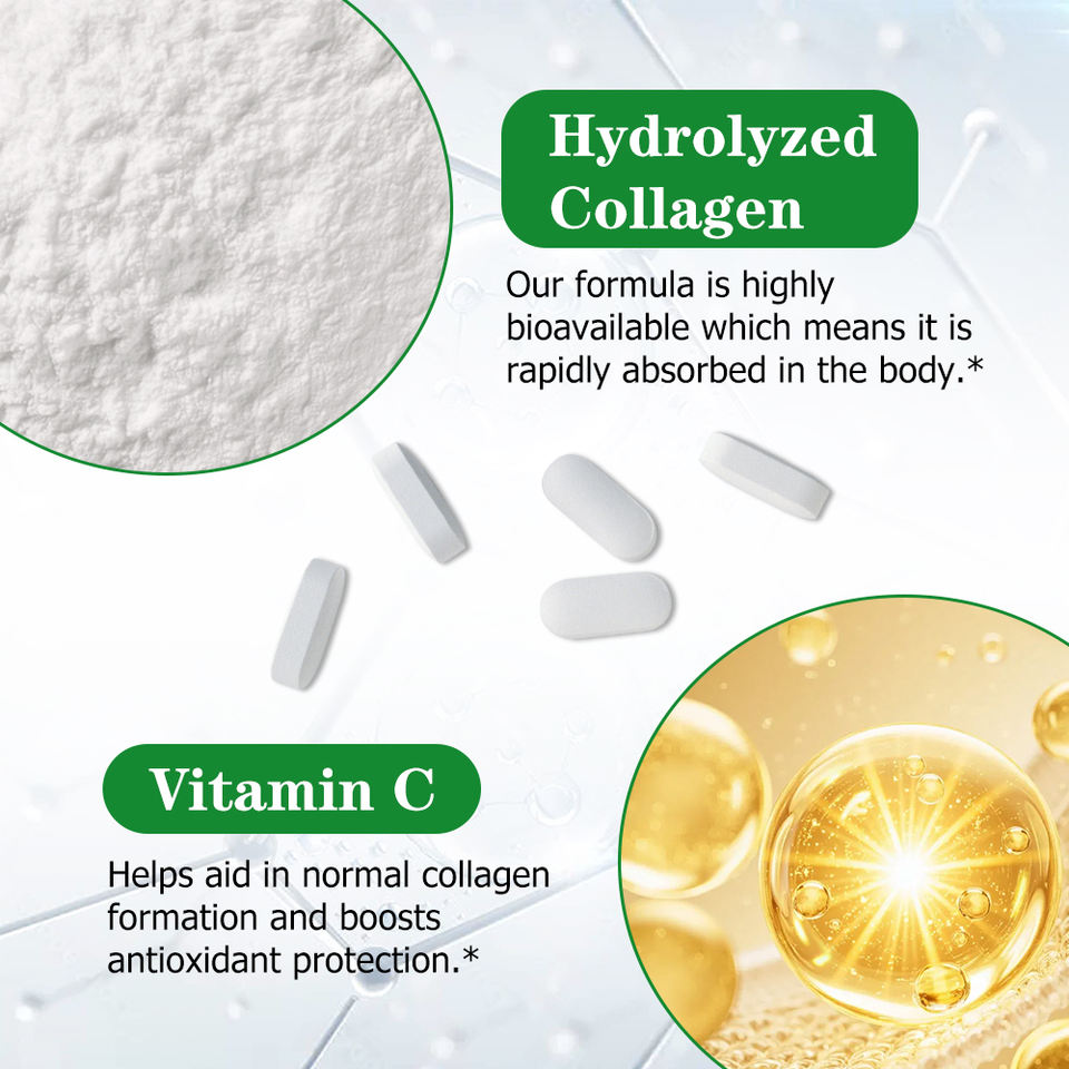 คอลลาเจนแบบเม็ดเสริมอาหาร สูตรเฉพาะ ผสมวิตามินซี เพื่อผิว ผม เล็บ ให้เปล่งประกาย