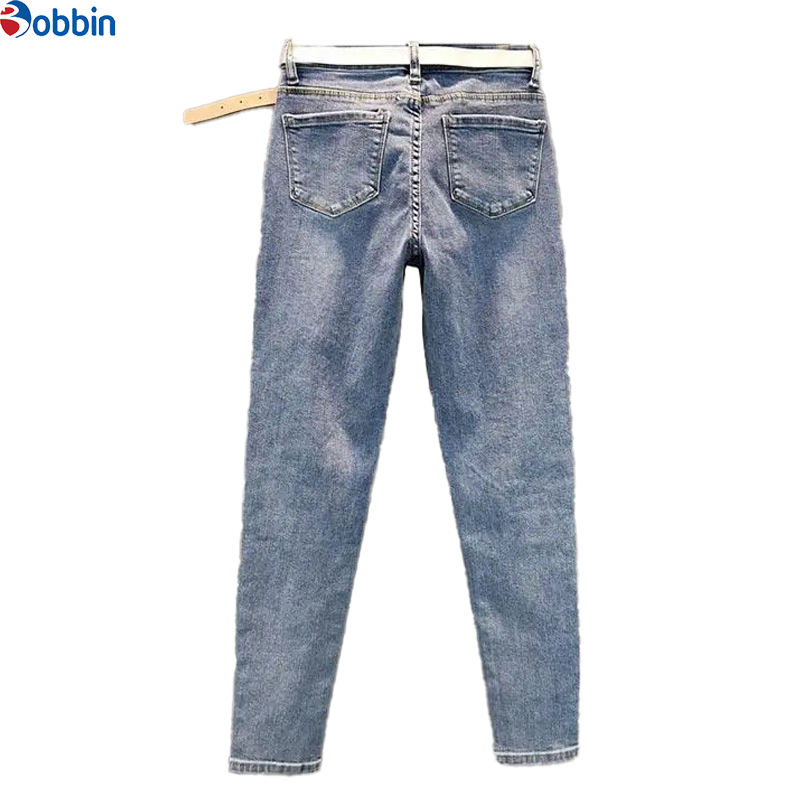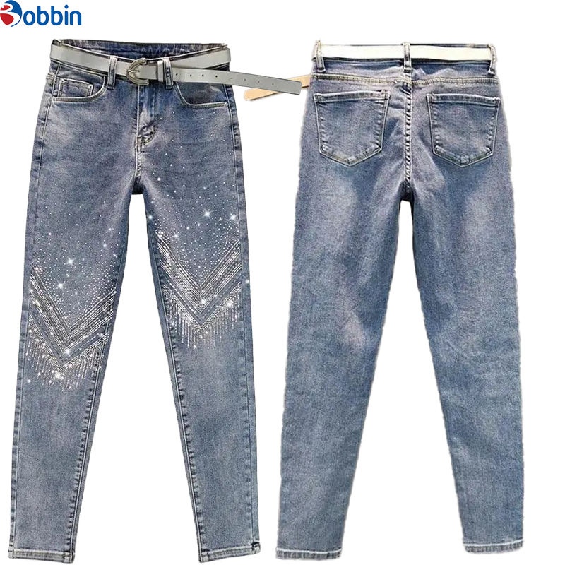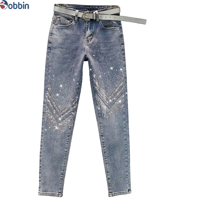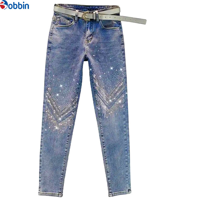 กางเกงยีนส์ผ้ายืดทรงสกินนี่ประดับเพชรพลอยเอวสูงสำหรับผู้หญิง ระบายอากาศได้ดี รุ่นใหม่ สวมใส่สบาย