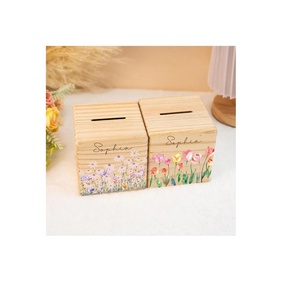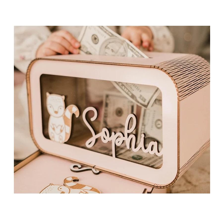 กระปุกออมสินไม้แกะสลักเลเซอร์แบบกำหนดเองสำหรับเด็ก กล่องใส่เงินอะคริลิกใสส่วนตัวสำหรับเด็กหญิง เด็กชาย ของตกแต่งห้องเด็ก กระปุกใส่เหรียญไม้